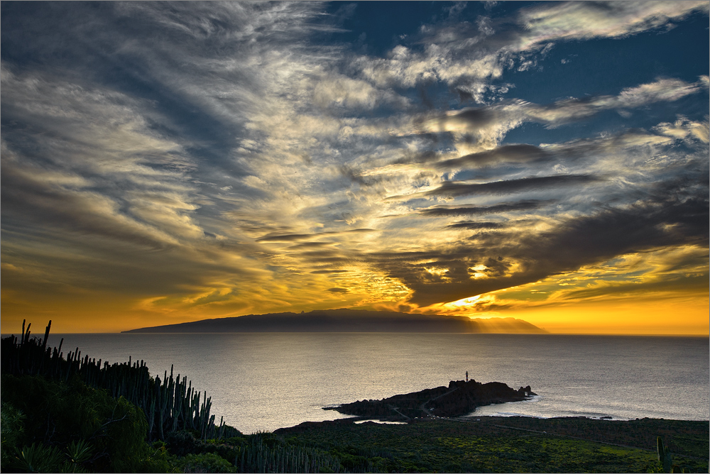 Als ich am Punta de Teno eintreffe zeigt es noch lässige 25°C, so kann man es aushalten. Ich packe meine Sachen und will gerade los als ein Wanderer auf mich zukommt und sich etwas in den Bart murmelt das Spanisch klingt. „Mi no habla esganol, do you speak englisch?“ „Yes I do!“ Der Akzent kommt mir bekannt vor „Where are you from?“ Er entgegnet: „I‘m from germany!“ Ich: „Na prima, dann können wir auch Deutsch sprechen…“ Nach einer kurzen Runde Smalltalk geht es den Berg hinauf. Als ich fast an meinem Fotospot bin fällt mir auf, dass ich mein Portemonnaie mit fast 1.000 Euro Bargeld und mein Telefon auf dem Beifahrersitz vergessen habe. Ich lasse die beiden Stative mit samt Nikon D800E und Panasonic Videokamera neben meinem Rucksack zurück und haste schnell den Berg hinab zum Auto. Dort angekommen greife ich mir schnell das Handy und meine Geldbörse und laufe den Berg wieder hinauf. Ich bin nass geschwitzt und aus dem Augenwinkel kann ich sehen, dass ich für den Sonnenuntergang schon fast zu spät bin. Einige Meter unterhalb der Stelle an der ich vor wenigen Minuten meine gesamte Fotoausrüstung abgestellt habe stehen plötzlich mitten in der Einöde zwischen den Kakteen zwei Wanderer. „Hallo Hallo“ entgegne ich und sie sagen „Sind das Ihre Kameras!“ „Ja das sind sie!“ „Oh schade, wir hatten uns gerade schon überlegt, dass wir sie mitnehmen könnten. Das wird dann ja wohl nichts!“ „Nein, die muss ich leider behalten :-)“ Die beiden grinsen und machen sich an den Abstieg.
