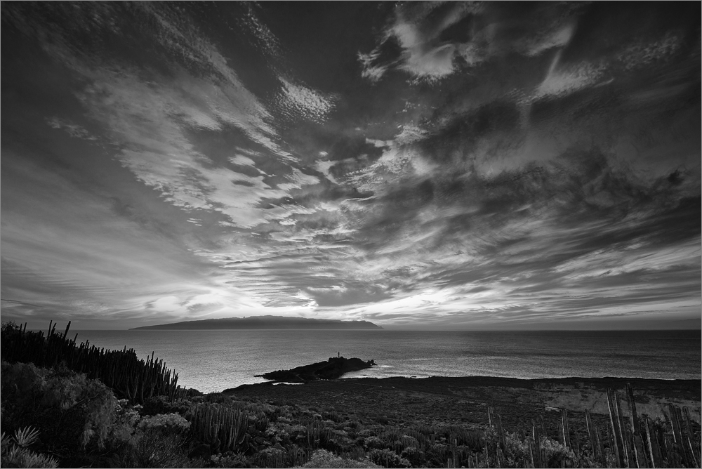 Ich bin zwar noch nicht an der Stelle die ich mir eigentlich ausgeguckt habe, aber wenn ich jetzt noch dorthin laufe, habe ich das Schauspiel verpasst. Also stelle ich die Video-Kamera auf, aktiviere den Zeitraffer mit einem Intervall von 1s und krabble mit der D800E mehreren Objektiven und dem großen Stativ den Berg hinauf. Etwa einhundert Höhenmeter weiter oben ist der Blick auf den Leuchtturm und La Gomera fast grenzenlos gut. Die Kamera wird aufgestellt und die Show beginnt. Der Spiegel klappert und ich knipse Bild um Bild. Irgendwann fällt mir auf, dass die Videosequenzen die ich zwischen den Fotos mit der D800E aufnehme etwas flackern. Das liegt daran, dass die Zeitautomatik mit Blendenvorwahl aktiviert ist. Also aktiviere ich die „Manuelle Belichtungseinstellung“, nun ändert die D800E während sie filmt weder Zeit, noch Blende oder ISO-Empfindlichkeit. Das ist super, so sollte man es eigentlich IMMER machen. Nichts sieht blöder aus als wenn eine Video-Sequenz einen Helligkeitssprung hat weil der Belichtungsmesser „denkt“ mal wieder etwas arbeiten zu müssen.