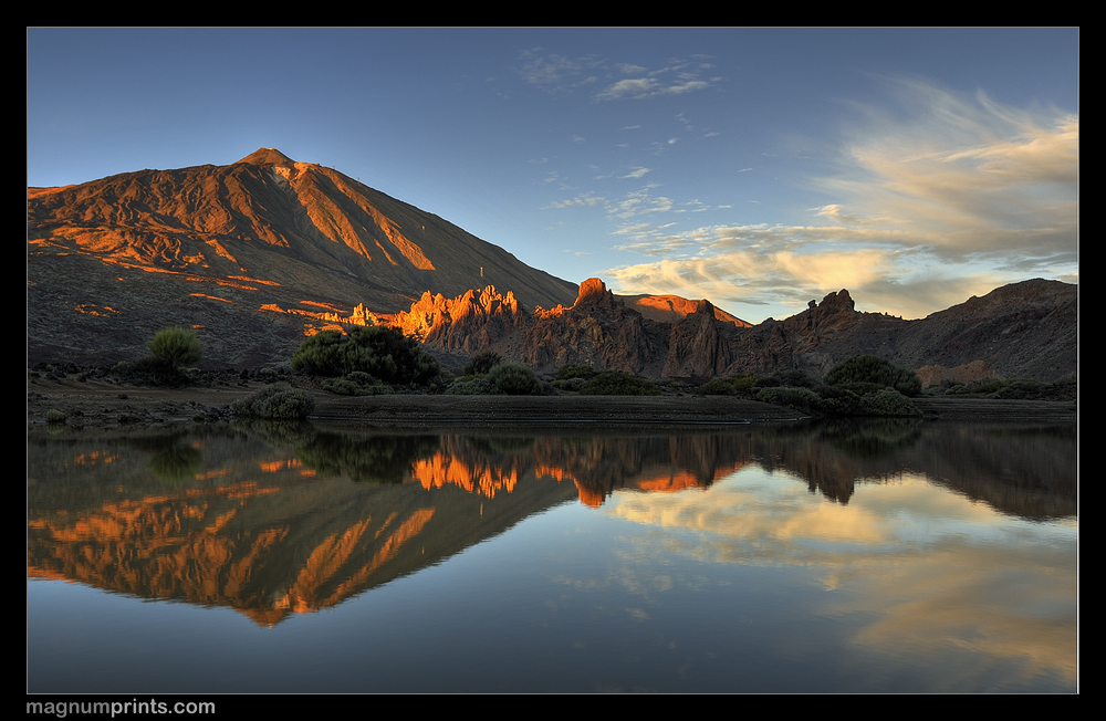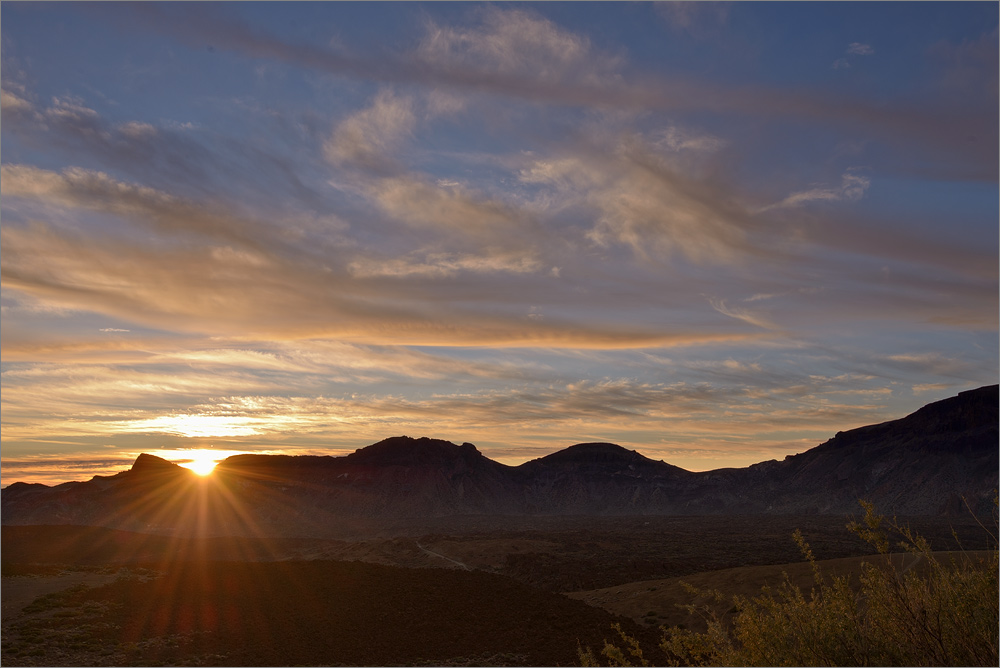 Als der 14. Tag für mich anbricht ist es 6:30. Ich beeile mich so gut es geht und bin um kurz vor 7h auf der Autobahn. Mein Ziel ist die Seilbahn die hier auf den schönen Namen „Teleferico“ hört. Dort will ich mich mit meinem facebook-Freund Aschraf treffen und ihn endlich im „richtigen Leben“ kennenlernen. Als ich die Mondlandschaft des “ Parque National del Teide“ in etwa 2200 Metern erreiche geht gerade die Sonne auf. Der zierlichen Wolkenstreifen am Himmel leuchten in zartem Rosa und über der Kraterwand der Canadas del Teide wird es langsam hell. Ich halte kurz an und montiere meine kleine GoPro HD HERO 1080 an das hintere linke Seitenfenster. Nachdem sie gestartet ist und ich mich versichert habe, dass sie auch gerade ausgerichtet ist, geht es weiter um Fuße des höchsten Berges der Spanier. Ein paar Minuten später treffe ich dort und. Es ist jetzt etwa 8:30 und ich bin der erste Besucher. Schnell ist das Auto geparkt, ich springe wie elektrisiert heraus, reiße den Kofferraum auf und baue in Windeseile mein kleines Video-Stativ auf. Die GoPro wird provisorisch auf eine kleine Mauer gelegt und so filmen zwei Kameras diesen kostenlose tägliche Naturschauspiel. Mit der Nikon D800E mache ich schnell ein paar Fotos und bin überrascht, dass das ganze Schauspiel nur einige wenige Minuten dauert.