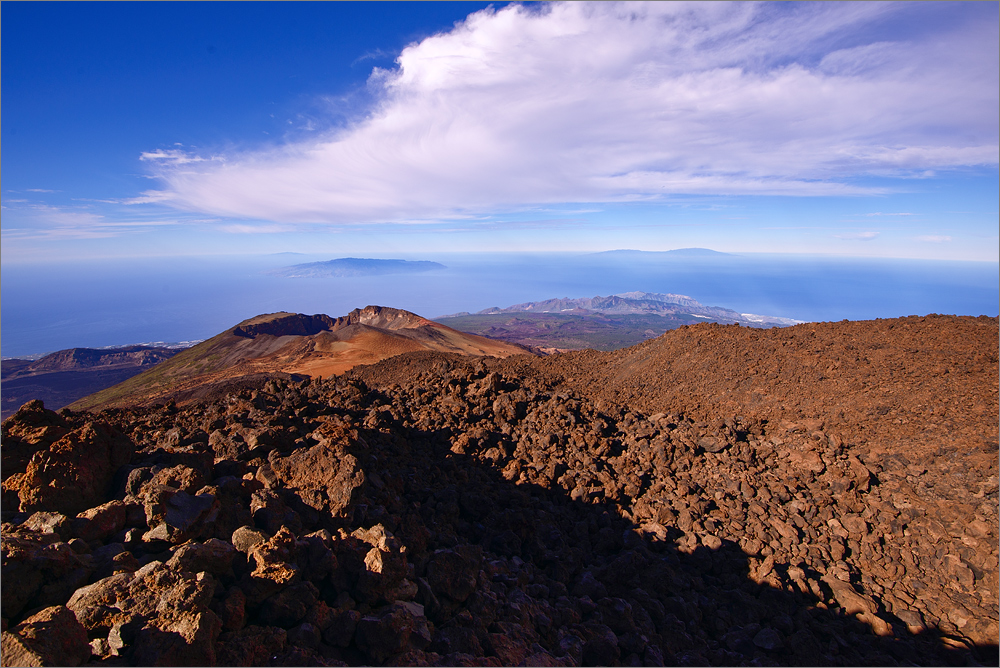 Wir laufen also zurück zur Station der Seilbahn und dann auf der gegenüberliegenden Seite in Richtung Westen. Von dort führt uns ein gut ausgebauter Wanderweg bergabwärts bis zu einem famosen Aussichtspunkt. Dort war ich bereits in den Jahren zuvor und es ist immer wieder atemberaubend. Heute ist es recht klar und wir können La Palma, La Gomera und El Hierro sehen. Vor uns liegt der Krater des jüngsten Vulkanes der Insel, der Pico Viejo. Sein Krater hat einen Durchmesser von ca. 800 Metern und ist etwas 250 Meter tief. Ehrfürchtig halten wir Inne und beschließen einige Höhenmeter in Richtung Pico Viejo abzusteigen. Hier ist der Weg deutlich anspruchsvoller, es ist mehr Krakseln als Wandern. Wir haben keine Wanderstöcke dabei und suchen mit den Händen Halt an den großen schwarzen Lavabrocken. Doch diese sind scharfkantig und rau, ein paar Handschuhe wären jetzt nicht verkehrt. Nach einer Weile müssen wir einsehen, dass wir mit unseren schweren Kamerarucksäcken besser nicht noch weiter absteigen sollten. Der Pico Viejo sieht aus als sei er zum Greifen nahe, aber es sind noch etwas 400 Höhenmeter die uns von der Kante des Kraterrandes trennen. Und dieser Krater ist wirklich gewaltig, auch wenn er aus luftiger Höhe recht „unscheinbar“ wirkt!