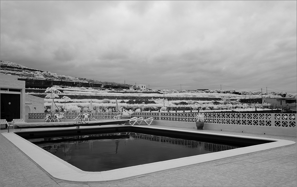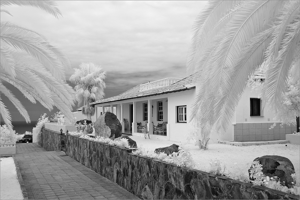 So gegen 12h machen wir uns auf den Weg ins Einkaufszentrum auf der anderen Seite der Autobahn unterhalb des Hügels auf dem unser Hotel thront. Im „Alcampo“ besorgen wir uns Shampoo, Kekse, Wasser, Bier und was man sonst noch alles braucht. Danach geht es zur Finca San Juan zu Jo Schlichting. Wir waren nun schon ein paar Wochen nicht mehr dort und irgendwie haben wir „Heimweh“. Natürlich interessiert es uns auch wie es dort mit der Bewirtung des Restaurants weiter geht. Auf der Finca angekommen ist die Freude groß als wir Jo und seine Frau Karo dort antreffen. Zusammen mit Koch Helmut schmeißt sie jetzt dort den Laden. Und der geht scheinbar richtig gut. Heute sind mehrere Gesellschaften dort, alles zusammen fast 75 Gäste. Am letzten Sonntag waren es 150 Gäste – Qualität zahlt sich aus und wir hoffen sehr, dass wir noch oft zum Brunchen oder Abendessen auf dieser tollen FInca sein dürfen. Gegen 15h verabschieden wir uns wieder und ich habe endlich Zeit ein par Fotos mit der auf Infrarot umgebauten Nikon D300 aufzunehmen. Später im Hotel bin ich dann echt hingerissen von den Ergebnissen. Und alles ist so einfach! Nichts Stativ, Filter ab – dran – ab – dran – ab – 30 Sekunden belichten – Rauschunterdrückung trallala – einfach ISO-200 einstellen, Blende 8 und „Klick“. Bei einer 1/250s gelingen scharfe Infrarot-Fotos aus dem Handgelenk – das ist mehr als cool!!