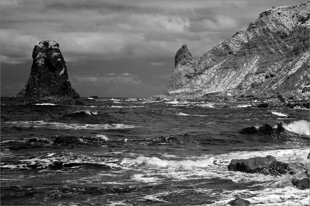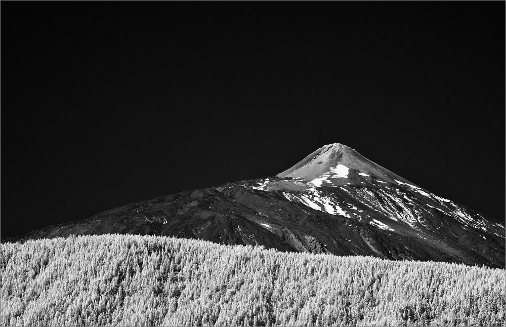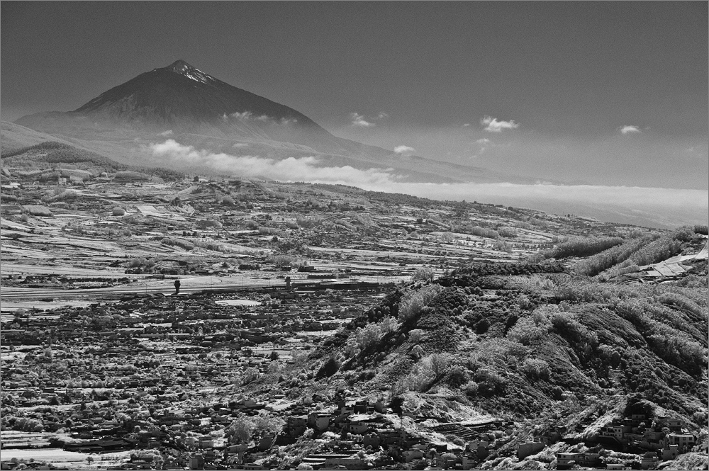 Nach etwa einer Stunde gebe ich auf und sammle Sandra wieder am Strand ein. Beide haben wir einen Sonnenbrand. Bei mir ist es mal wieder die Nase, bei ihr der Rücken, Schultern, eigentlich ist fast die halbe Frau rot von der intensiven Sonne. In einem der vielen Restaurants gibt es ein großes Glas Bier mit Sprite – lecker! So gestärkt fahren wir die gefühlten 1.000 Kurven zurück zum Hotel. Am Mirador oberhalb von Las Mercedes springe ich kurz mit der D300 aus dem Auto um quer über die Insel hinweg ein Foto meines Lieblingsberges zu schießen. In den letzten Tagen und Wochen hat sich der Gute häufig in Wolken versteckt, nun ist er endlich einmal sehr schön klar zu sehen. Ein wenig dunstig ist es rund herum, aber die Infrarot-Kamera vermag das zu einem guten Stück zu durchdringen, so dass letztlich doch zwei ganz brauchbare Fotos entstehen.