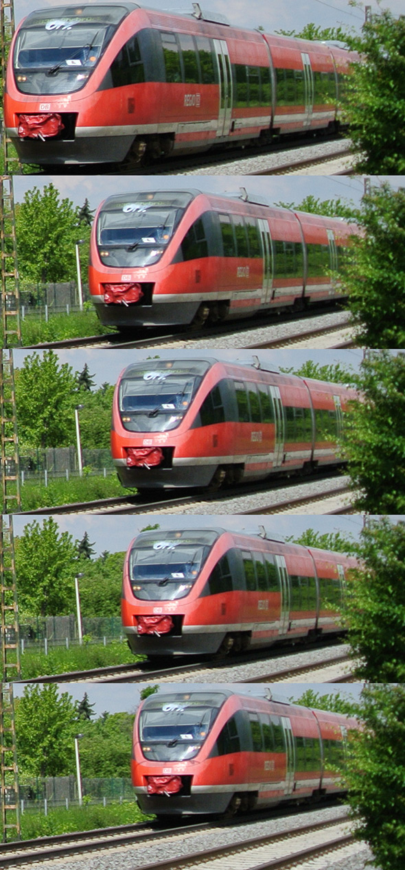 Hier habe ich dieses Feature an einem Motiv ausprobiert in dem niemand lächelt. Tatsächlich hat die Kamera das zweite Bild dieser Serie als das „Beste Bild“ vorgeschlagen. Wie dieses Ergebnis erzielt wurde ist mir allerdings unklar 🙂 Aus den 5 Einzelbildern habe ich hier für Euch eine kleine Montage erstellt. Hier könnt Ihr sehen wie schnell diese Kamera einen Zug ablichten kann der mit etwa 100 km/h an mit vorbei gebraust kam.