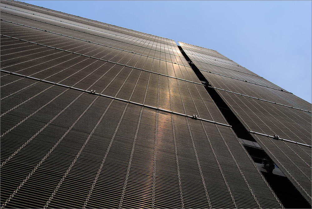 Auf der Suche nach bösen Moiré-Mustern habe ich diverse kleinteilige Fassaden aus unterschiedlichen Perspektiven fotografiert. Aber die Moiré-Muster halten sich in Grenzen. Im folgenden Bild habe ich es geschafft ein sichtbares Moiré-Muster zu erzeugen. Normalerweise wird man solche Effekte aber nicht sehen.