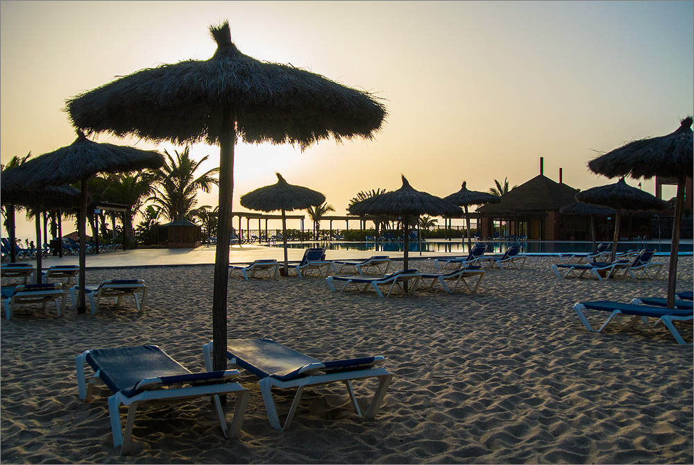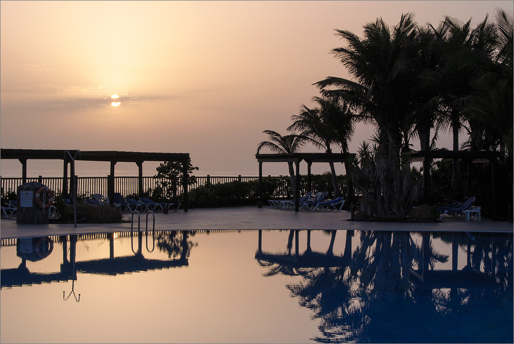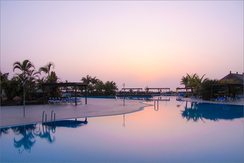 Die Hotelanlage ist sehr weitläufig, es ist schon fast eine kleine Stadt. Nachdem wir unsere Koffer ausgepackt haben erkunden wir die Anlage und landen in einer netten kleinen Pizzeria direkt am Pool. Die Pizza ist ganz ordentlich, wenngleich auch keine kulinarische Offenbarung. Aber mir schmeckt es und das große kalte Cerveza schmeckt dazu richtig gut. Nach der Pizza und einem zweiten Glas Bier bin ich ein wenig angetrunken und so fällt mir unser kleiner Spaziergang unerwartet schwerer als gedacht. An der Bar im Loungebereich ruhen wir uns etwas aus. Sandra bestellt sich einen Bailey‘s und ich ordere einen „Barraquito con Vitaminas Canarias“. Der Barkeeper versteht nicht sofort was ich meine, aber dann grinst er breit – „Si, con Vitaminas Canarias!!!“ Die Kaffeeköstlichkeit die er danach für mich zaubert gehört zum Besten was ich jemals getrunken habe. Erst kommt dicke süße Milch in ein großes Teeglas. Darauf kommt ein Kanarischer Likör, die Vitamine und weil sie sooo gesund sind, ist er nicht kleinlich damit. Anschließend lässt er gekonnt einen Espresso aus frisch gemahlenem Kaffee darauf laufen. Er hält einen Löffel dazwischen, so dass sich die Schichten kaum vermengen. Unten weiß, dann heller Likör, dann schwarzer Kaffee. Danach wird eine Haube aus frisch aufgeschäumter Milch darauf gesetzt. Es folgen drei kleine Kaffeebohnen und ein großes Stück von einer frischen Limette. Als Krönung erhält mein Barraquito ein „Stäubchen“ aus Zimt und Zucker. Dieses Heißgetränk ist der Hammer!!