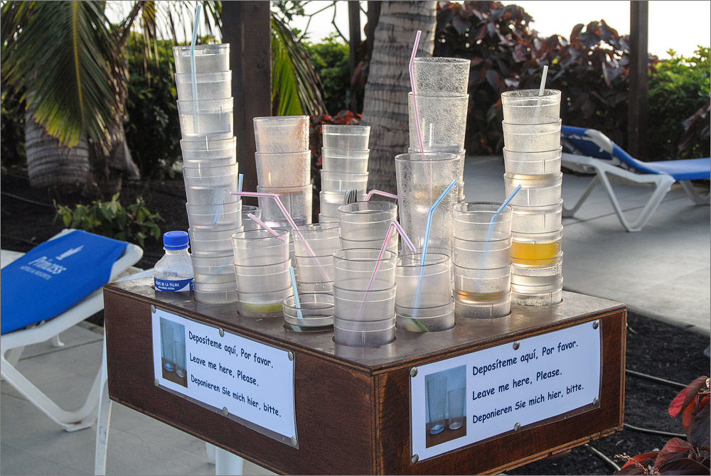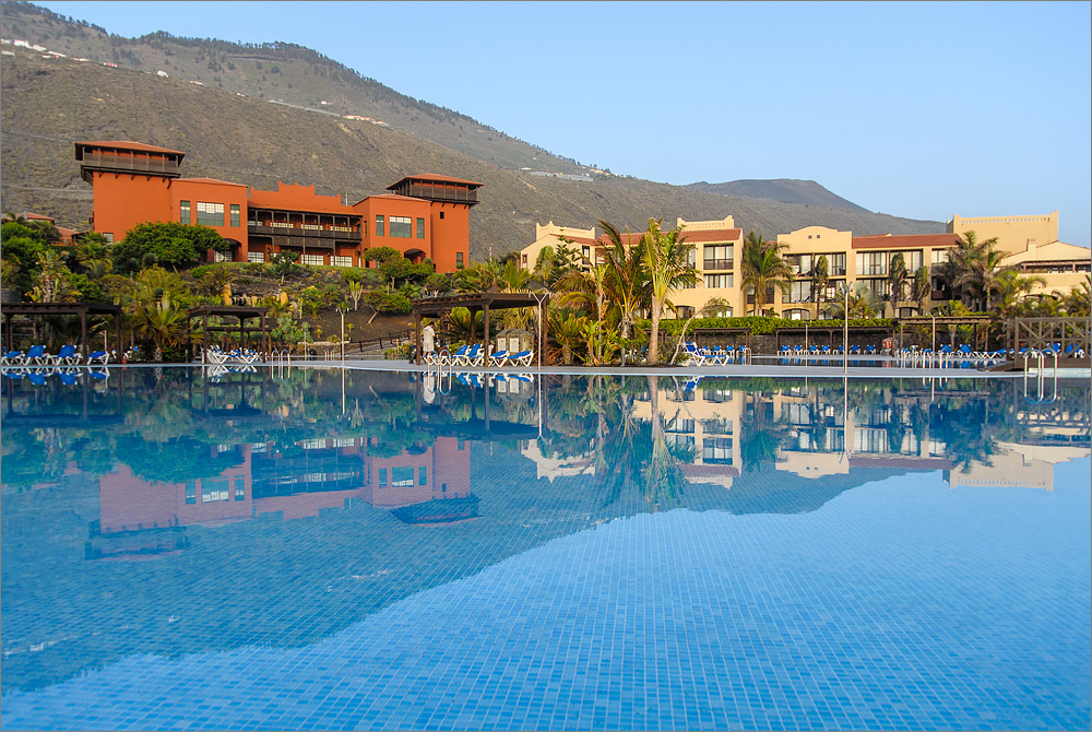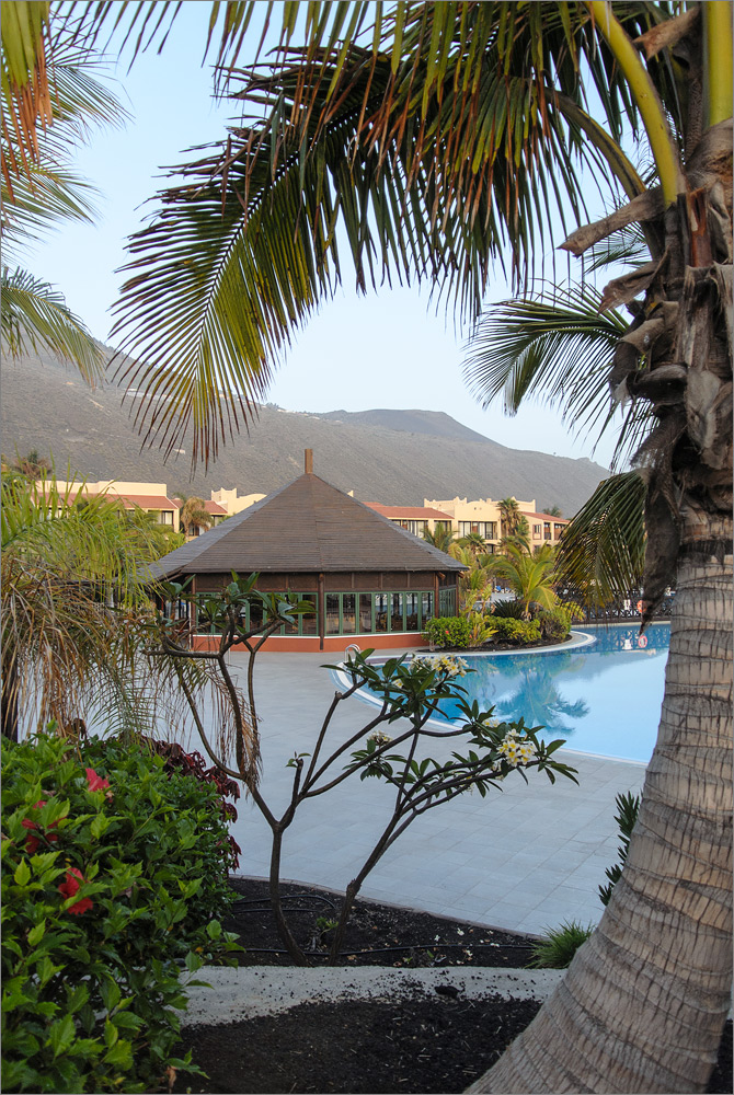 Einige Internet-PCs gibt es auch, aber hier kosten 10 Minuten Internet 1,- Euro! Gleich daneben sind zwei große Flachbildschirme und jeweils zwei XBox Controller. Hier können Kids ein Motorrad-Rennen ausfechten. Es gibt auch Billard-Tische, ein Spiel kostet allerdings 2,- Euro. Unser Zimmer ist etwas abgelegen im EG mit Blick auf eine Wiese, Palme und einige Häuserdächer. Das Meer kann man nicht so wirklich sehen, einen kleinen Zipfel sieht man schon, aber meine Hoffnungen hier Abend für Abend tolle Sonnenuntergänge mit vielen Zeitraffer-Aufnahmen festzuhalten muss ich mir leider abschminken. Die Reise kostet 2.127,- Euro, wir haben ein Doppelzimmer Typ 1 und Halbpension. Was genau sich hinter „Typ 1“ verbirgt war mir bei der Buchung nicht ganz klar. Sicher hätte man es irgendwo im Kleingedruckten nachlesen können, aber wir haben sehr kurzfristig gebucht und waren froh überhaupt so kurzfristig eine Reise nach La Palma zu bekommen die einen Non-Stop Flug und ein ordentliches Hotel enthält.