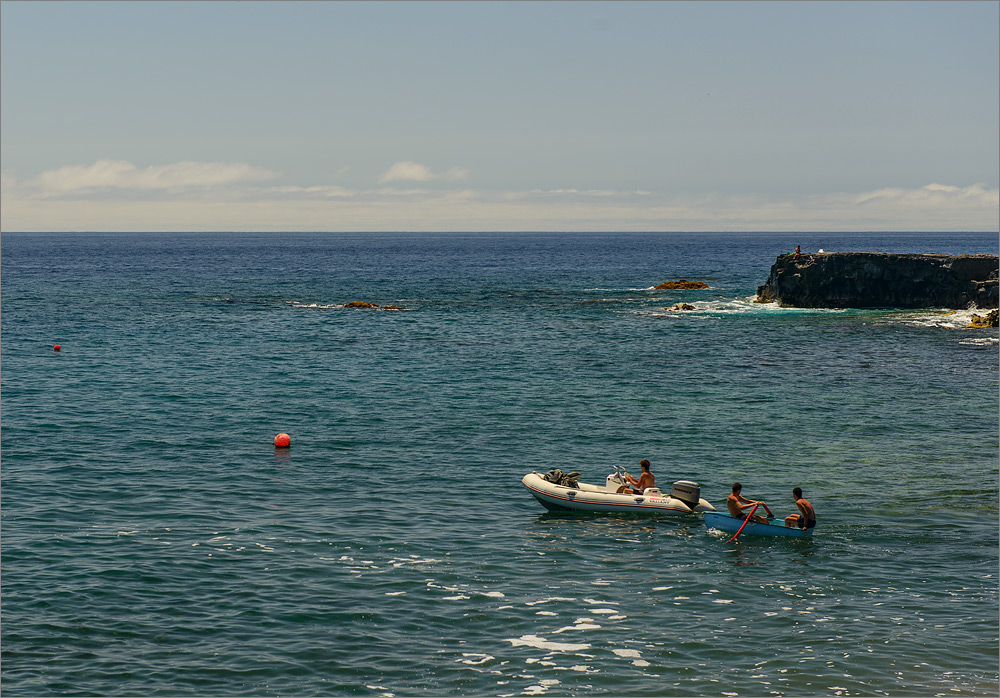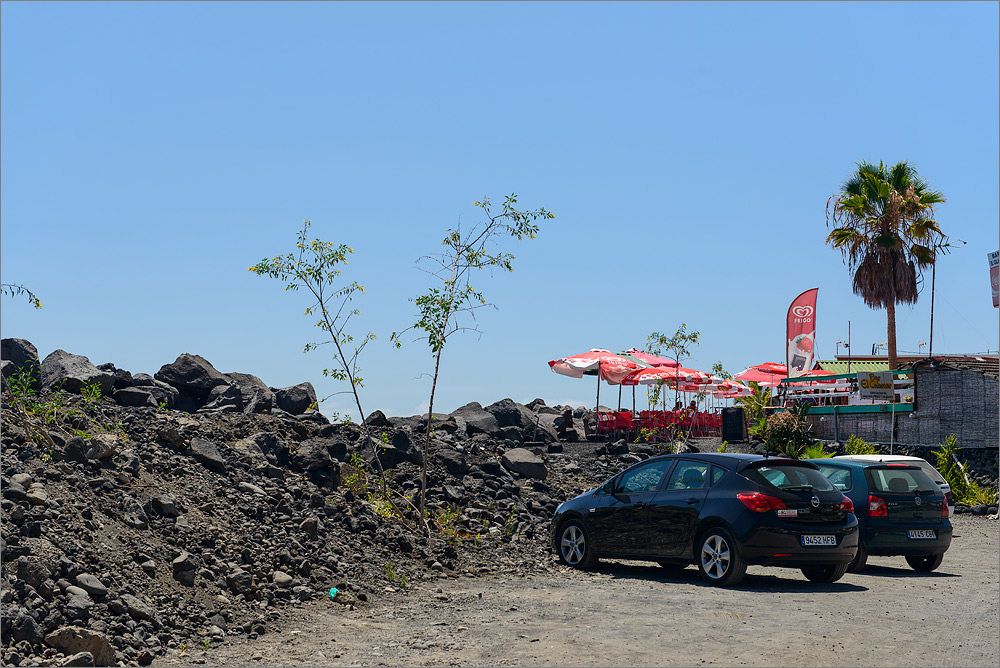 Am Mirador El Time haben wir vor ein paar Tagen ein kleines Gratis-Magazin gefunden. Dort sind viele schöne Restaurants auf dieser Insel verzeichnet. Gleich mittendrin findet sich das El Calamar. Wir machen uns gegen 12h auf die Reise und treffen um kurz nach 13h dort ein. Den Weg den Berg hinab habe ich mit meiner kleinen GoPro gefilmt und so werden wir von den Jugendlichen unten bei den Fischbuden ganz schön argwöhnisch beäugt. Unser Auto parken wir gleich neben der Fischbude. Unter den kleinen roten Sonnenschirmen sitzt man direkt am Meer. Nur ein paar Lavabrocken trennen uns und das Wasser. Es riecht ein wenig nach Meer, aber nicht aufdringlich. Es gibt leckeres kaltes Bier und frischen Fisch. Danach einen Barraquito, das Leben kann so schön sein 🙂