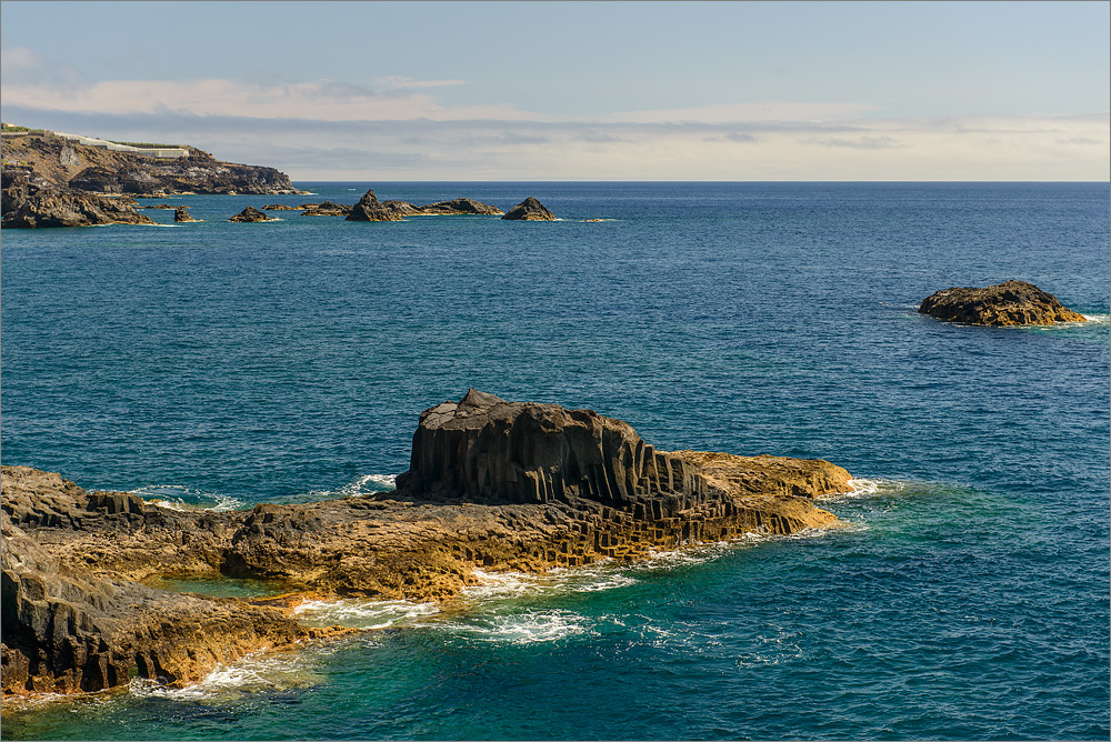 Während Sandra liest fahre ich mit der D800E und der D300 in die „nördlichen Plantagen“. Das klingt fast ein wenig nach Jack Harper, ist aber viel weniger spektakulär. Aber es gibt ein paar schöne Ausblicke gen Nord-Westen. Unter der Steilküste sind einige nette Lava-Felsen im Meer. Die würden sich vor der Kulisse eines gewaltigen Sonnenunterganges sehr gut machen. Dann noch einen 8x Graufilter und eine hübsch lange Belichtungszeit, schnell wäre ein famoses Kitschbildchen geschossen.