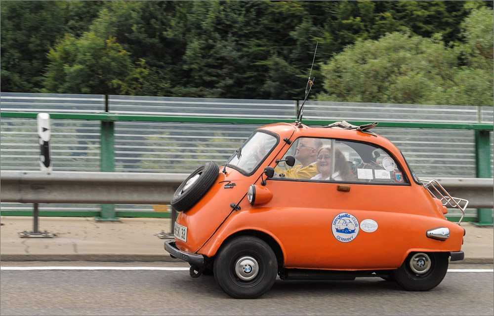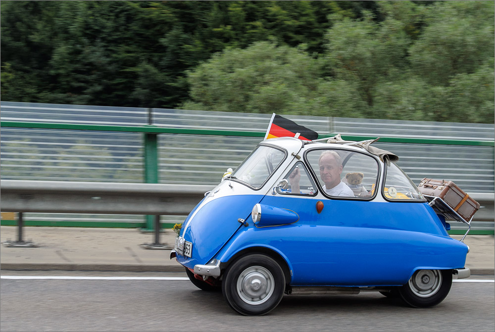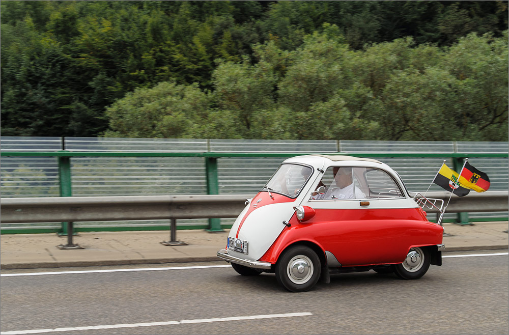 Bei meiner gestrigen Fotosession in der Nähe von Kreuzberg in der Eifel kam plötzlich der größte Isetta-Schwarm angefahren den ich bislang gesehen habe. Es hatte der Isetta-Fanclub zum Jahrestreffen 2013 in Mayschoß in der Eifel geladen. Ich wußte davon natürlich nichts und umso überraschter war ich, als plötzlich minutenlang eine Isetta nach der anderen an mir vorbei knatterte. Zwei dieser alten Fahrzeuge lieferten sich dabei sogar ein offensichtlich nicht ganz ernst gemeintes „Stechen“!!
