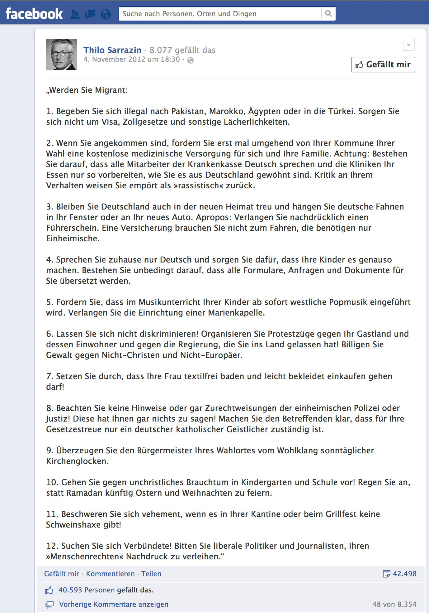 Vor etwa einem Jahr hat das ehemalige Vorstandsmitglied der deutschen Bundesbank namens Thilo Sarrazin (Bitte beachten sie die Schreibweise, das hat nichts mit Sarin zu tun!) uns via Facebook einige lange überfällige Tipps zur illegalen Einreise und Migration in fremde Länder gegeben.