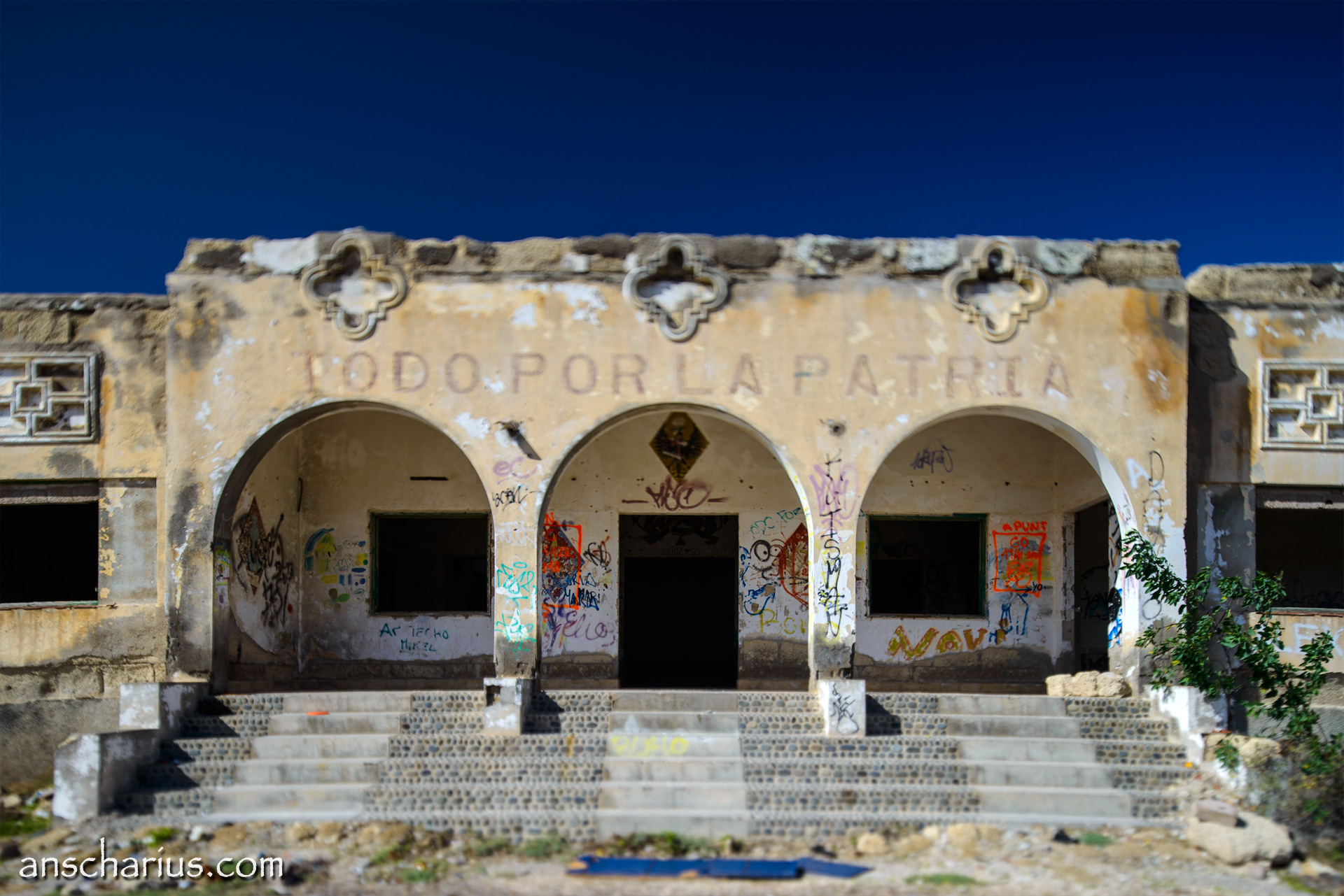 Etwa eine Stunde später beschließen wir uns weitere Gebäude der Geisterstadt anzuschauen. Aber es ist äußerst stürmisch und wir müssen aufpassen, dass der Wind unsere Kameras nicht samt Stativ einfach umwirft. Gegen 16h meldet sich der Hunger und meine Sandra schickt mir auch schon eine SMS, dass sie genug vom den Wasserrutschen und anderen Attraktionen im Siam Park hat.
