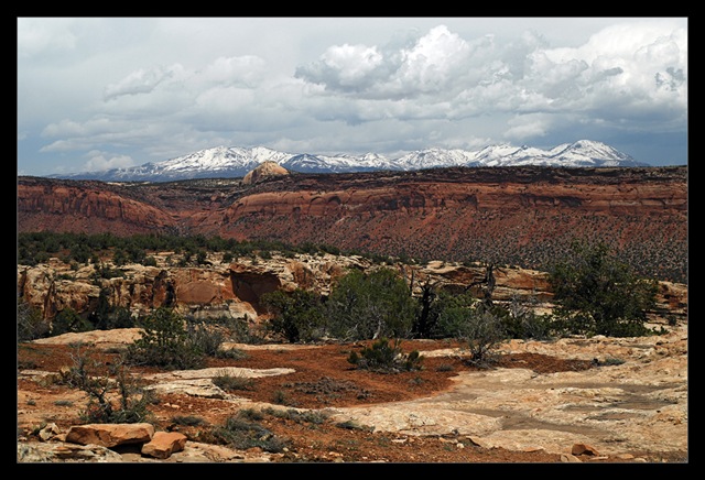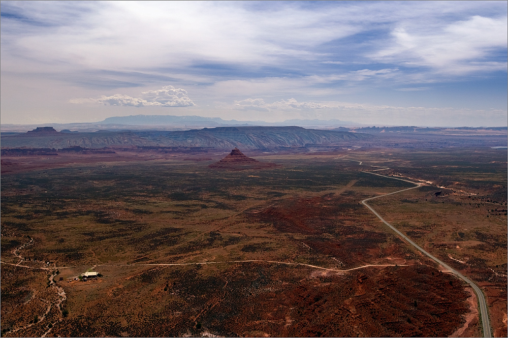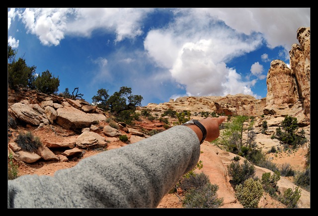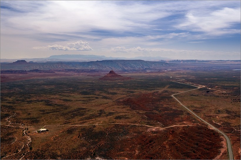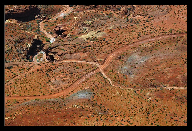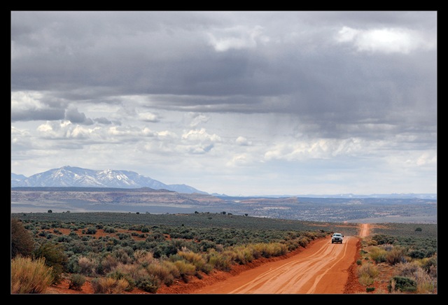 Die 5 Minuten Wegplanung währen des Schreibens am morgendlichen BLOG erweist sich während der Fahrt als nicht ganz korrekt. Ist aber alles kein Problem, denn an der entscheidenden Stelle steht ein Wegweiser. Ab hier sind es noch 6 Meilen und die sind wirklich heftig. Zwischendurch setze ich an allen entscheidenden Stellen mit dem GPS einen Wegpunkt. So ist es später leichter eine bessere Route zu erstellen. Da es mit dem 12-Volt Kabel für das GPS immer noch nicht geklappt hat ist Sandra mein Navigator. Wenn das Ding mit voller Beleuchtung auf Batteriebetrieb läuft ist es immer noch so dunkel. dass man fast nichts erkennen wenn es an der Windschutzscheibe hängt. Also hält Sandra es in der Hand und gibt mir Anweisungen. Das klappt auch ganz prima. Zwischendurch verliert sich der Weg auf den Felsplatten. Man sieht keine Reifenspuren mehr und die Steinmännchen sind wirklich selten auf Anhieb zu sehen. Aber die topografische Karte von Utah ist sehr gut und dort ist der Weg zum Alstrom-Point sogar eingezeichnet. Also einfach der gestrichelten Linie folgen.
