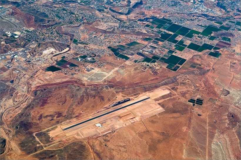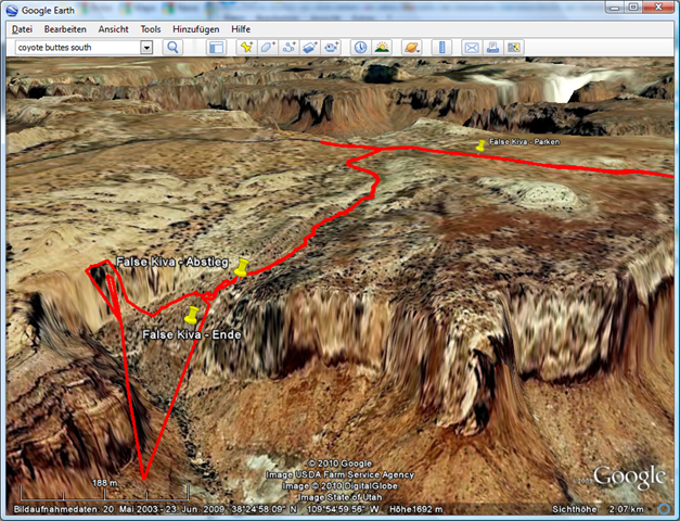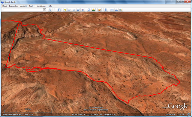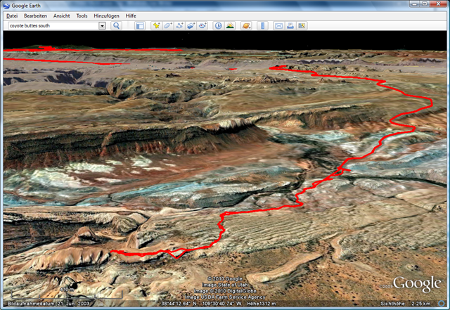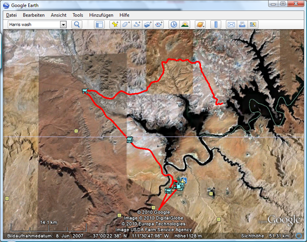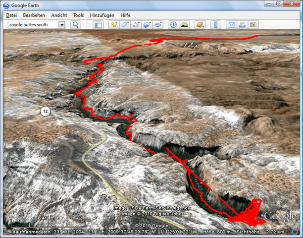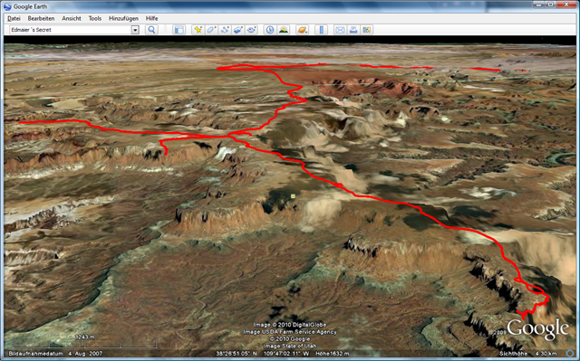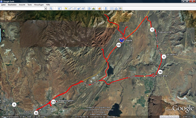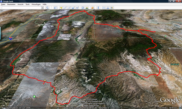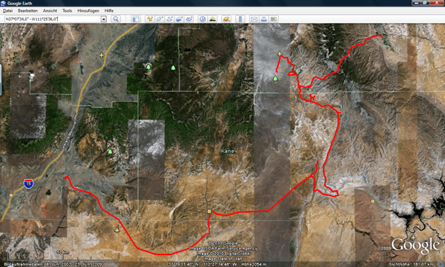 Auf dem Screenshot sieht man auch sehr schön die Grenze zwischen Utah und Arizona. Eingeblendet ist gerade eine topografische Karte für Utah. Arizona ist einfach nur eine weiße Fläche weil keine passende Karte aktiv ist.