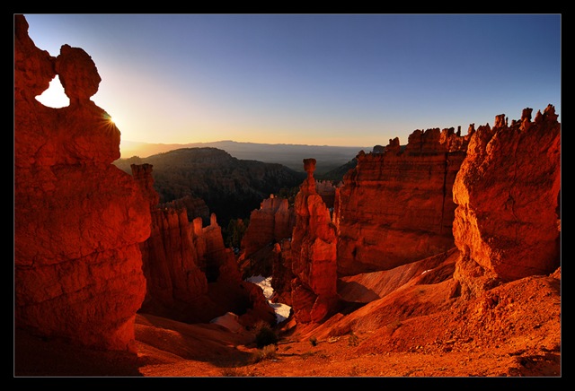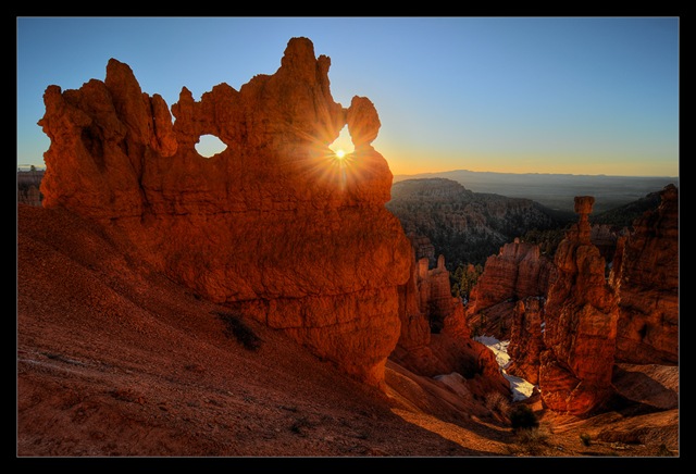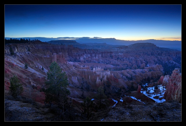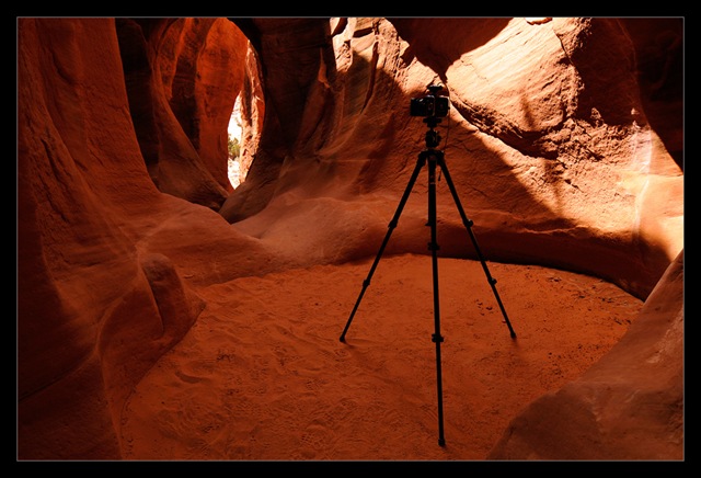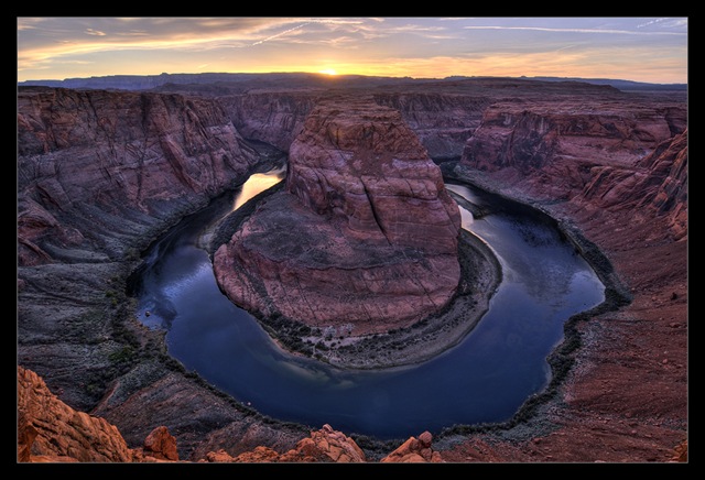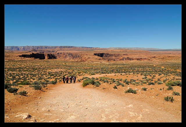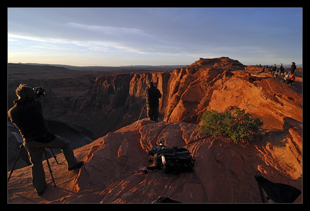 Nach etwa drei Stunden und einigen kleineren Fotostopps ist es dann geschafft. Und der Ausblick entschädigt für die Schinderei. Wir genießen die wunderbare Aussicht und überlegen ob wir den Sonnenuntergang abwarten wollen. Hm, dass alles wieder zurück – bei Dunkelheit? Kein wirklich gute Idee. Wie wäre es mit einer kleinen Session zum Sonnenuntergang am Horse-Shoe-Bend?? Also rein ins Auto und los. Etwa um 18h30 sind wir dann am Horse-Shoe-Bend. Es sind noch etwa 30 Minuten bis Sonnenuntergang. Der Parkplatz ist brechend voll und auf der Klippe stehen die Fotografen artig in Reih und Glied. Wir stellen uns dazu. Ich mache ein paar Belichtungsreihen und schließlich packe ich die schrullige Hasselbald SWC aus. Schnell sind vier Bilder gemacht. Dann fällt mir auf, dass ich den Deckel vom Objektiv nicht abgenommen habe. Au Backe, Sucherkameras muss man echt mit Umsicht und Sorgfalt bedienen. Aber es ist ja kein Problem, ich habe noch ein paar Filme in der Jackentasche. Also einfach nochmal das Ganze. Blende 11 und 1/4s – ob das was wird? Der Belichtungsmesser der Nikon D300 sagt “JA” – mal sehen…