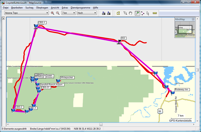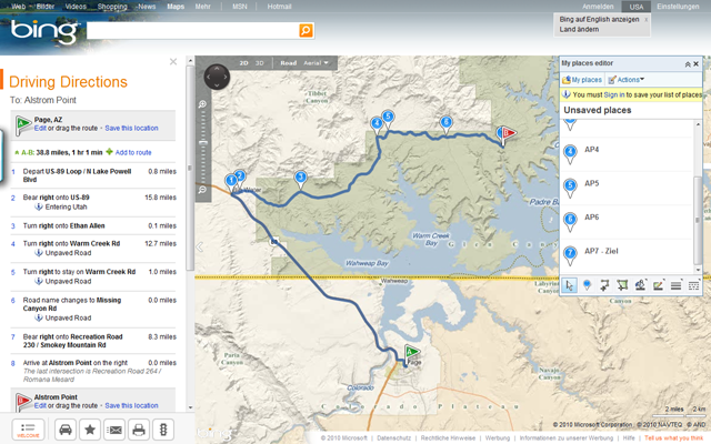 Die Bing-Maps sind sehr hilfreich. Ich gebe einfach nur Page und Alstrompoint ein und schon habe ich die Route. Danach ein paar Wegpunkte setzen und die dann in das GPS übertragen. Wenn man mag kann man sie auch wieder mit Garmin Mapsource in den Rechner übertragen. Dort kann man dann weitere Punkte setzen, eine Route daraus machen und das dann alles zusammen wieder an das GPS senden. Ok, die Route kann man auch am GPS erstellen, aber mit Mapsource ist es viel bequemer.