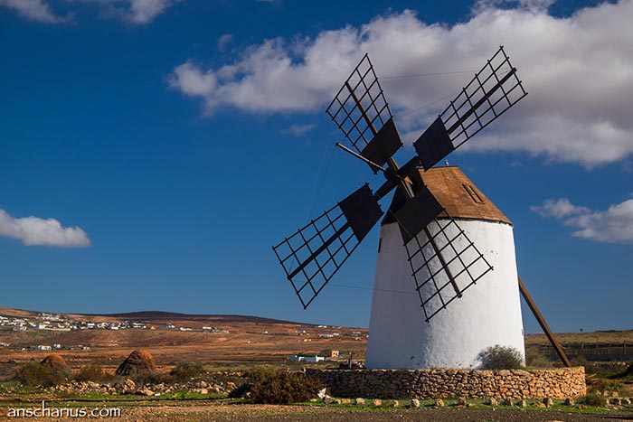 Die für mich größte Überraschung war Fuerteventura. Zuvor hatte es geheißen, dort gäbe es nur wenig mehr als einen schönen Strand. Aber wer so etwas sagt, hat Fuerteventura noch nicht mit den Augen eines Fotografen gesehen. Die flache wüstenähnliche Landschaft, die extrem tief hängenden Wolken, die vielen Windmühlen und authentischen kleinen Ortschaften, all das ist wunderschön.