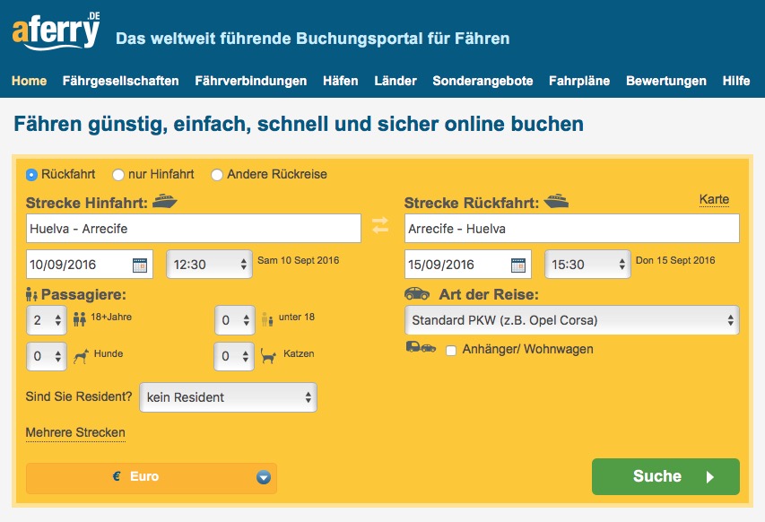 Die Fähre startet in Huelva jeweils Samstags. Im Jahr 2016 ist der 24. September der letzte Tag an dem Lanzarote direkt angelaufen wird. Danach muss kann man Fuerteventura oder auch Lanzarote sehr einfach mit einer Fähre via Gran Canaria erreichen.