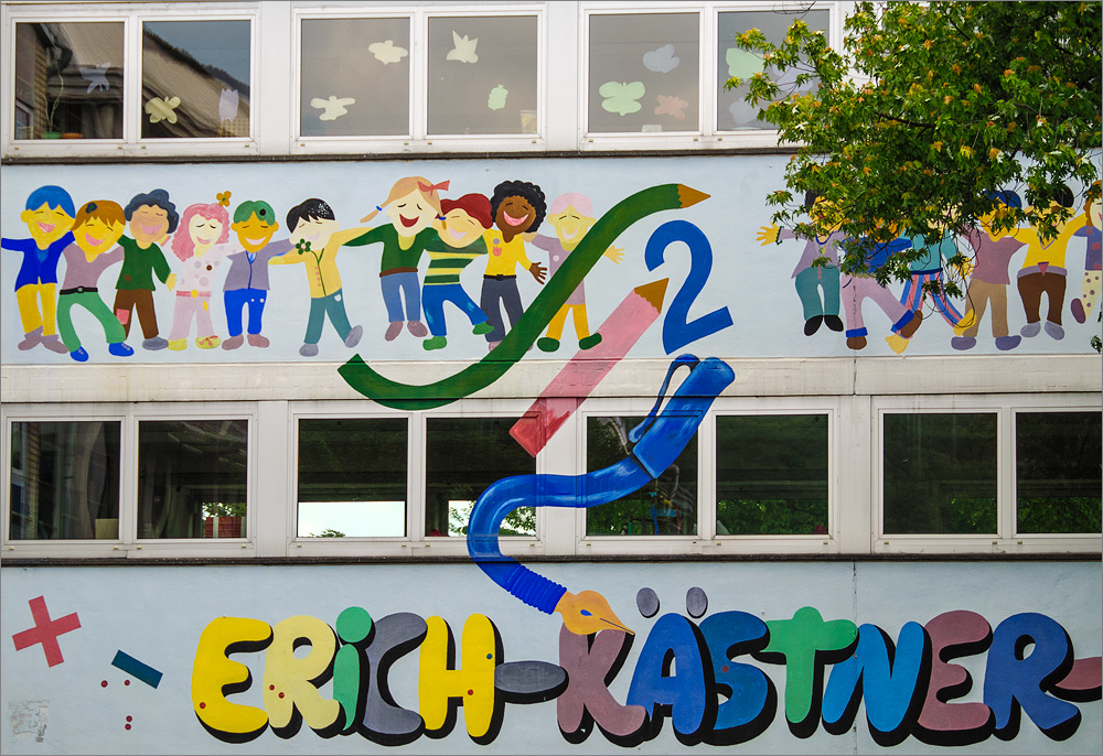 Noch ein Blick auf die bunte Fassade der Erich-Kästner-Grundschule auf der anderen Straßenseite und schon geht es wieder weiter…