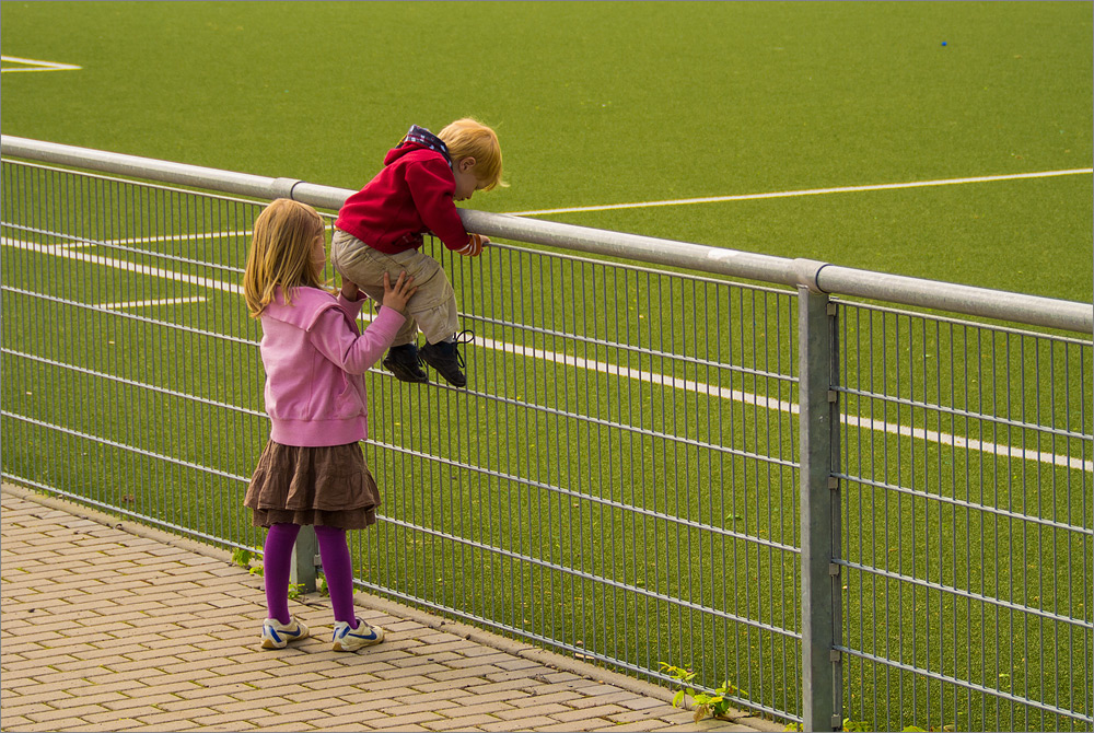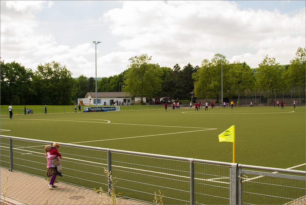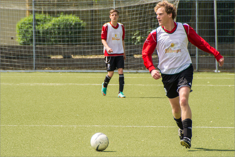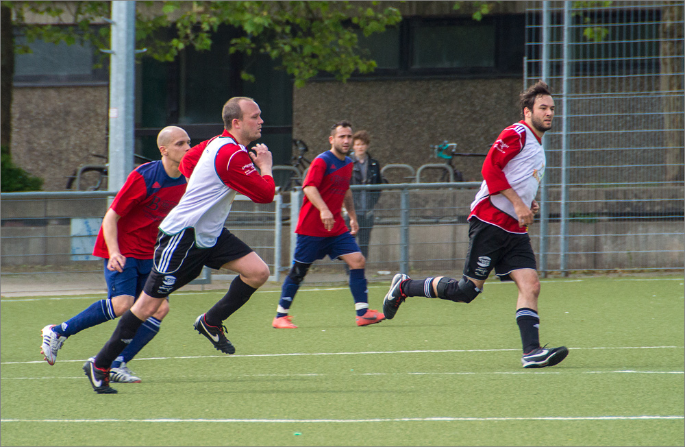 Vom Rand des Spielfeldes habe ich ein paar Minuten die Freizeitfußballer durch den elektronischen Sucher der Nikon 1 V1 verfolgt. An der Kamera habe ich den „Brust-Mode“ mit irre schnellen 30 Bildern pro Sekunde eingestellt. Die Kamera kann sogar noch mehr, selbst 60 Bilder/s sind möglich. Aber bei meinen ersten Tests musste ich feststellen, dass die Verarbeitung der gewaltigen Datenmengen diese kleine Kamera schnell für einige Minuten außer Gefecht setzt sobald der schnelle interne Speicher voll ist und das Bildmaterial auf die deutlich langsameren SD-Karten ausgelagert werden muss.