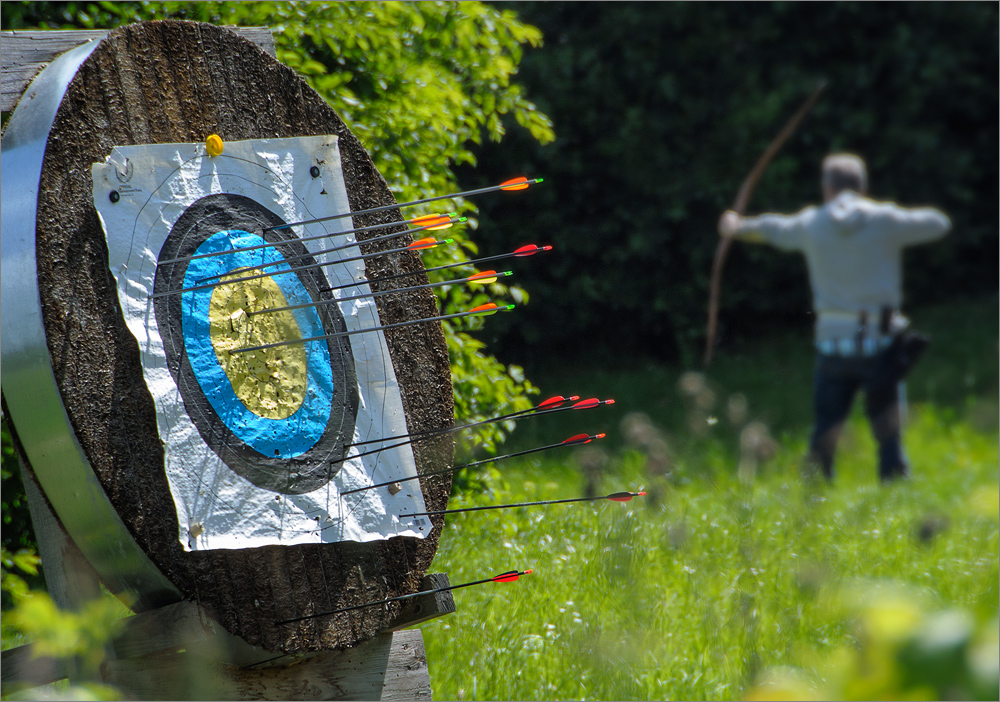 Doch genug gemeckert, in Verbindung mit dem AF-S VR 18-200mm ist trotz des kleinen Sensors der Nikon 1 die Arbeit mit selektiver Schärfe kein Problem. Es muss einfach genügend Abstand zwischen den bildwichtigen Inhalten sein. Dann kann man wie im folgenden Bild die Zielscheibe im Vordergrund sehr schön mit dem unscharfen Bogenschützen im Hintergrund „erklären“.