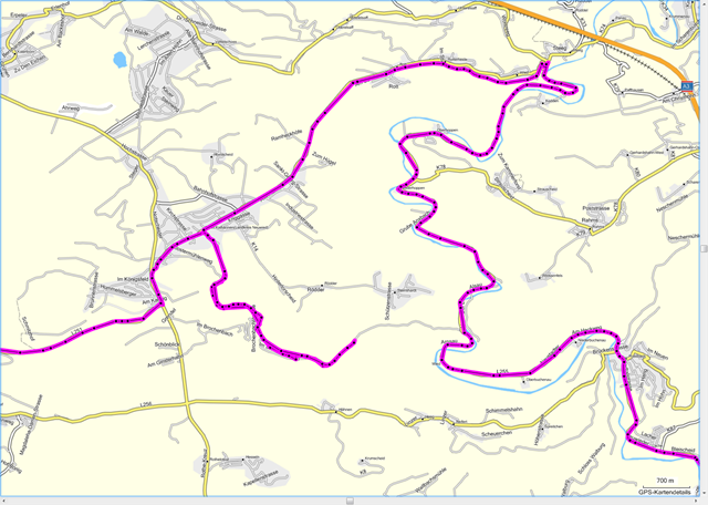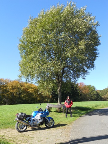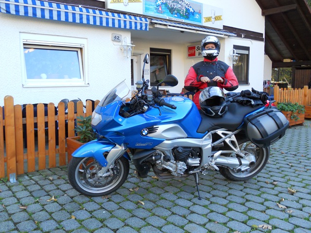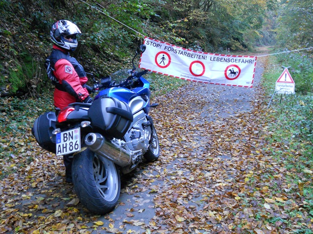 Kaum daheim ist es schon wieder Samstag. Die Sonne scheint und nichts hält uns im Bett. Schnell in die Klamotten und los. Heute soll es am Rhein entlang bis Linz gehen, dann gen Osten und in großen Kreisen wieder nach Hause. Alles ist gut und dann kurz hinter Linz sagt das TomTom, dass ich doch in eine winzig kleine Straße abbiegen soll. Ist das Ernst gemeint?? Ok, wir biegen ab. Die Routenführungsoption “Kurvenreiche Strecke” wird schon wissen was sie errechnet – hoffentlich. Die Straße ist eng, sehr eng. Wir sind zu zweit auf meiner blauen Turbine, unter dem 190er Hochgeschwindigkeitsreifen knacken die Eicheln im nassen Laub. Nicht gut, gar nicht gut!