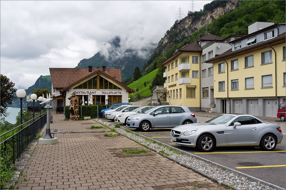 Als wir auf der Höhe der Tellsplatte sind, halten kurz an. Hier zeigt sich schnell, dass es ein Fehler war den Weitwinkel-Konverter daheim zu lassen. Die Berge auf der anderen Seite des Sees sind majestätisch und wirklich schön, aber sinnvoll ablichten lassen sie sich mit der Fuji X100 aus dieser Perspektive leider nicht. Auch habe ich meinen kleinen selbstgebauten Nodalpunktadapter daheim vergessen. Irgendwie bin ich weniger gut vorbereitet als ich es gedacht hatte…