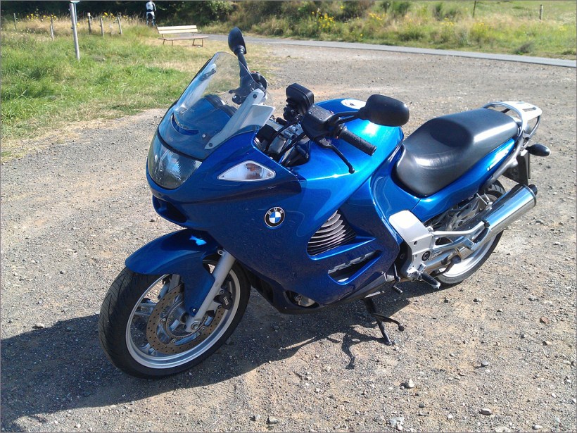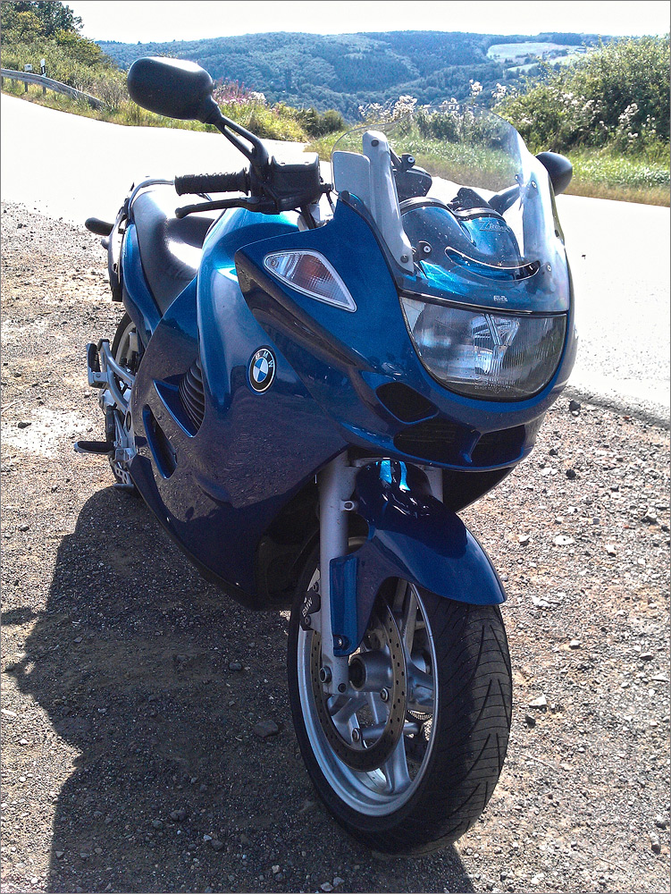Heute war das Wetter großartig und wir hatten uns nach langer Zeit endlich einmal wieder zu einer gemeinsamen Tour verabredet. Statt meiner blauen BMW K1200r Sport war ich heute mal mit einer BMW K1200RS Baujahr 2001 unterwegs. Dieses Motorrad hat in den letzten Wochen einige kleine Modifikationen erfahren. Die leicht verschrammte Standard-Scheibe ist einer kurzen leicht getönten neuen Scheibe gewichen. (Gibt es bei amazon.de für ca. 219,- Euro) Die hässlichen gelben Blinker mussten modischen weißen Pendants weichen, das Rücklicht ist auch weiß und wird von einer ganzen Batterie roter LEDs beleuchtet. Auf den Rädern drehen sich zwei nagelneue Michelin Pilot Road 3. Die Stummellenker sind über zwei Zwischenstücke etwas erhöht montiert und so wurde es auch möglich, einen RAM-Mount für eine TomTom Urban Rider zu befestigen. Auf dem Tacho stehen mehr als 100.000 Kilometer, aber der längs eingebaute 131 PS starke Vierzylinder-Reihenmotor verrichtet seine Arbeit noch ganz ordentlich.