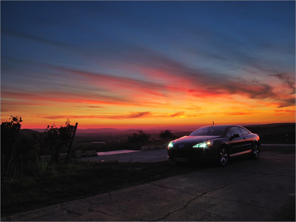 Hin und wieder halte ich mal an, Dach auf, Dach zu, Knips hier Knips da, dann geht es wieder weiter. Der SLK macht Spaß, trotz des „kleinen“ Motors ist er nicht träge. Das eng abgestufte Automatikgetriebe hält den Motor stets im optimalen Drehzahlbereich, so kann er die Kraft die er hat auch bei jedem Tritt auf das Gaspedal fast sofort ausspielen. Langsamer als mein Peugeot 407 Coupé kommt er mir nicht vor, nur quirliger.