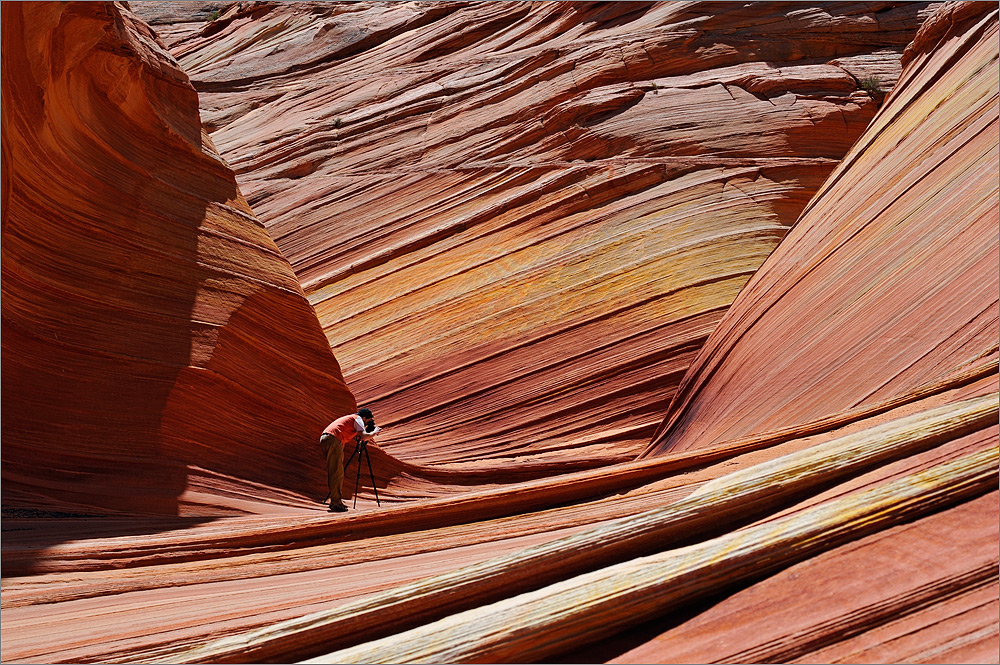Am Eingang der Wave ist die Wandergruppe die uns inzwischen wieder überholt hat mit den ersten Shootings beschäftigt. Fast alle waren schon einmal hier. Jeder fotografiert jeden, es ist witzig! Wir kraxeln die letzten Meter hoch, bis wir die Wave von oben sehen können. Da gibt es Schatten und ein zweites kleines Frühstück. Mein Hemd ist pitschnass, aber ich habe ein Reserve-Hemd dabei! Die verschwitzten Klamotten hänge ich zum Trocknen auf einen Strauch. Dann machen wir mit beim täglichen Rudelknipsen.Ich schnappe mir ein paar der Fotografen und gebe zum besten, dass ich im letzten tausende von Bilder von der Wave geschossen habe, die aber alle samt total langweilig sind weil da einfach Menschen auf den Bildern fehlen. Das wirkt! Die Männer schicken ihre Frauen in die Wave. Alle müssen so tun als würden sie gerade wie Gogol Lobmayer am Ende von “Faszination Natur” durch die Wave wandern. Das ist echt witzig. Irgendwann hat Sandra sich erholt und kommt dazu. Wir machen es auch. Sie kommt die Wave hoch, ich gehe die Wave hoch. Während ich hinunter gehe um mich beim Hinaufgehen fotografieren zu lassen kommt mir eines der Galeriebilder von Albert Witz ein auf dem er sich mit Selbstauslöser geknipst hat wie er genau wie ich gerade in die Wave hineinläuft. Ob ich dafür auch ein Galeriebilder in der Fotocommunity hinkriege? Ich denke nicht, die Fotocommunity ist voll mit Bildern der Wave. Während ich da später so herum klettere und die anderen Fotografen anschaue wird mir auch klar warum. Selbst wenn am Tag nur 20 Besucher dorthin dürfen, so werden dort doch täglich mindestens 2.000 Bilder geknipst. Mal mit Stativ, mal ohne, mal mit dem Handy, mal mit einer teuren Hightech Kamera. Es ist witzig!