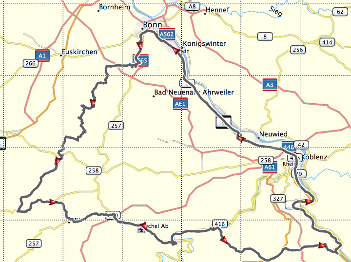 Wir sprechen uns kurz ab und starten dann in Richtung Café Fahrtwind. Sandra und mir knurrt der Magen, wir freuen uns auf ein entspanntes Frühstück in der Mittagssonne. Bei der Ausfahrt Meckenheim ist dann wieder ein Stau auf der Autobahn, ja hört das denn niemals auf? Alle die gestern nach Bonn gefahren sind wollen heute scheinbar in die Eifel. Das sieht nicht spaßig aus und wir fahren gleich wieder ab in Richtung Meckenheim. Mein TomTom berechnet die Route neu und will links abbiegen, warum nicht? Letztlich führt es uns einmal im Kreis und will dann zurück zur Autobahn. Als ich endlich erkenne was das kleine Ding zu denken scheint – können Navis denken? – halte ich kurz an und ändere die Routenführung auf „Autobahn vermeiden“. Es geht weiter, das TomTom möchte jetzt über Adenau fahren, warum nicht? Doch dann ist schon wieder alles vorbei, wir stehen vor dem nächsten Stauende. Scheinbar haben sie es alle so gemacht wie ich „Stau umfahren auf den nächsten 10 Kilometern“ – na prima…