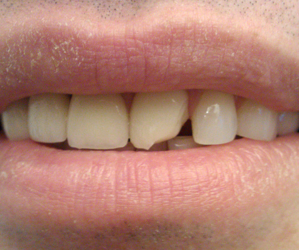 Mitten im Schlaf knackt dann etwas in meinem Mund. Ich werde wach und spüre etwas scharfkantiges auf der Zunge. Ohje, was ist das denn? Schlaftrunken taumle ich ins Bad. Vor dem Spiegel wird mir klar was geschehen ist. Ich habe scheinbar so krass mir den Zähnen geknirscht, dass der linke Schneidezahn zerbrochen ist. Nicht schon wieder! Hört das denn nie auf? Gerade habe ich eine erfolglose Kieferoperation hinter mir. Danach wurde der gebrochene Eckzahn gezogen und ich versuche mich jetzt an die Delle im Kiefer und die neue Brücke zu gewöhnen. Nun bricht der andere Schneidezahn auseinander. Das darf alles nicht wahr sein. Das abgebrochene Stück bleibt im Bad vor dem Spiegel und ich gehe frustriert zurück ins Bett.