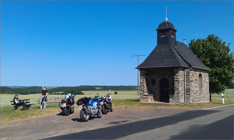 Bei Cochem erreichen wir die Mosel und stehen eine halbe Ewigkeit an einer Baustellenampel. Als es endlich grün wird, eröffnet sich uns das gesamte Ausmaß dieser Baustelle. Ganz Cochem ist eine Baustelle und auf der Hauptstraße unten an der Mosel staut sich der Verkehr über viele Kilometer. Es ist inzwischen wirklich warm und ich bin froh, dass wir am Stau vorbeifahren können. Es geht weiter entlang der Mosel. Bei Treis-Karden kreuzen wir die Mosel und schon wieder geht es in Serpentinen die Berge hinauf. Oben angekommen gibt es eine kleine Kappelle mitten in den Feldern. Hier habe ich schon oft Mopedfahrer bei einer kleinen Pause gesehen. Warum sollten wir hier nicht auch mal rasten?