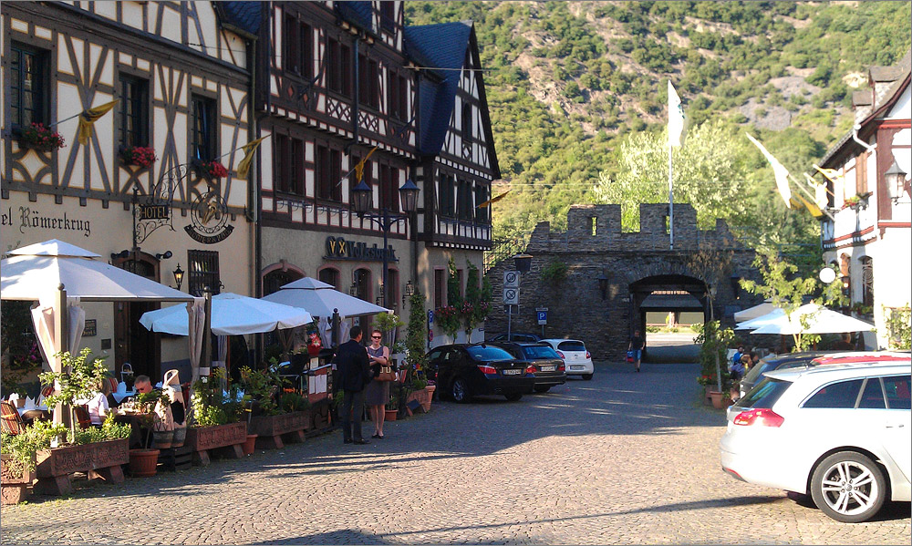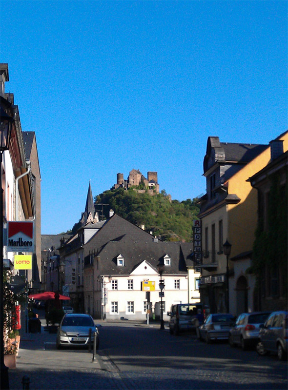 Kurz vor Oberwesel haben wir einen fantastischen Blick hinab ins Rheintal. Hier würde ich gern anhalten und ein paar schöne Fotos machen, aber wir haben keine Kamera dabei. An einer kleinen Anhöhe sieht es so aus als wäre dort ein kleiner Aussichtsplatz, also Blinken und raus. Aber es ist nur der Anfang eines staubigen Feldweges. Unter den verwunderten Blicken meiner „Beifahrer“ fahre ich wieder weiter. In Oberwesel finden wir bei einem Italiener ein schönes schattiges Plätzchen. Es gibt ein Steak mit Fritten und Salat – lecker!