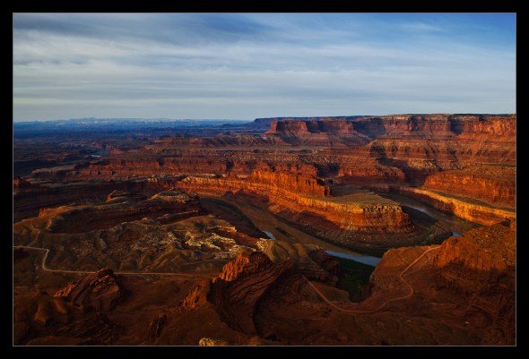 Sobald die Sonne über den La Sal Mountains aufgegangen ist kann man sich schnell nach Westen orientieren und dort sehr schöne Bilder der Klippen „Goosenecks“ des Colorado Rivers aufnehmen. An klaren Tagen scheinen diese Klippen im Morgenlicht regelrecht aufzuglühen. Das sich der Wolkenhimmel über dem Dead-Horse-Statepark immer wieder anders zeigt ist es oft eine gute Idee diesen magischen Ort mehr als nur einmal zu besuchen! Schauen wir uns diese beiden an zwei aufeinanderfolgenden Tagen fotografieren Bilder an. Sie sind sehr verschieden und zeigen sehr anschaulich, dass man während einer 14-tägigen Reise nicht einfach die tollsten Locations „abklappern“ sollte. Es lohnt sich durchaus seine Reise gut zu planen und sich einzelne „magische Orte“ durchaus mehrmals „vorzunehmen“. Letztlich wird die Anzahl unterschiedlicher Motive geringer aber die Liste der Bilder bei spektakulärem Licht höher sein.