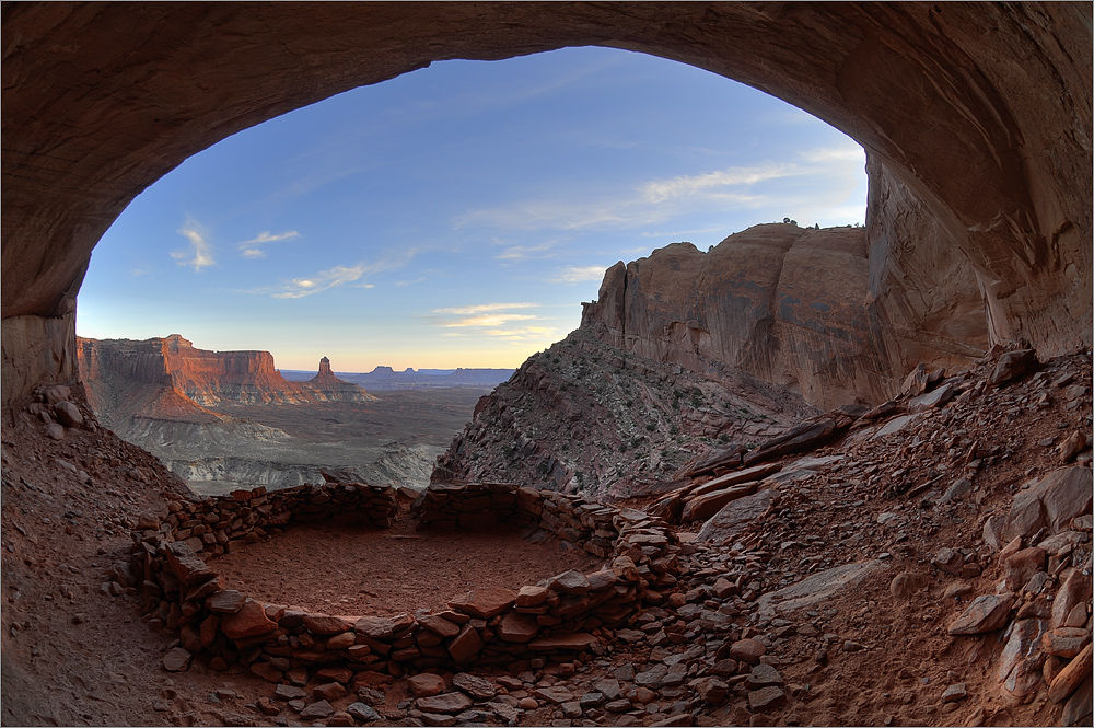 Dann kommt in Pärchen zur False Kiva hoch gestiegen. Sie setzen sich mitten in die alte indianische Rundung aus Stein und öffnen eine Flasche Wein. Nun sind sie auf allen Fotos. Eigentlich wollen sie den Sonnenuntergang hier genießen, wir würden aber gern Fotos ohne Touristen mit Weingläsern machen. Als ich anfange ihnen zu erzählen, dass ich ihre Haut in Photoshop rot und ihre Haare schwarz einfärben werden, damit sie wie “Native Americans” aussehen, verstehen sie und ziehen wieder ab. Wir packen kurz drauf zusammen und wollen gerade los, als die Klippen vor der False Kiva anfangen intensiv rot im letzten Abendlicht aufzuglühen. Schnell die Kameras wieder raus! Um 20h ist die Herrlichkeit vorbei. Der Reisecomputer im GPS hat den Sonnenuntergang heute für exakt 20h vorausgesagt – perfekt!