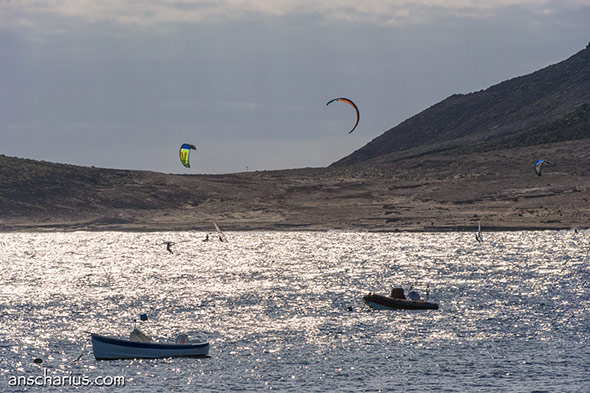 In El Medano scheint die Sonne wie man es sich nur wünschen kann. Es ist wunderbar warm und es geht ein frischer Wind. In der Bucht von El Medano sind rund 100 Surfer mit Kites und anderem Gerät unterwegs. Wir steuern das Restaurant Hong Kong gleich neben dem Hotel El Medano an und lassen es uns dort gut gehen. Später gibt es noch einen Spaziergang und ein paar Fotos der wagemutigen Surfer draußen auf dem Meer. Ich habe heute leider nur meine Nikon 1 V3 mit dem 10-100mm „Reisezoom“ dabei. So gelingen keine wirklich spektakulären Fotos, aber ich kann ja in den nächsten Wochen nochmal mit dem neuen 70-300mm Telezoom vorbeikommen. Umgerechnet auf das FX-Format habe ich damit ein 189-810mm Teleobjektiv, damit kann man hier am Strand sicher ordentlich was reißen. Ich bin gespannt…