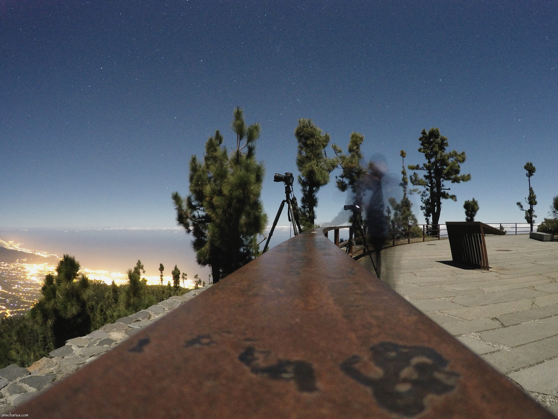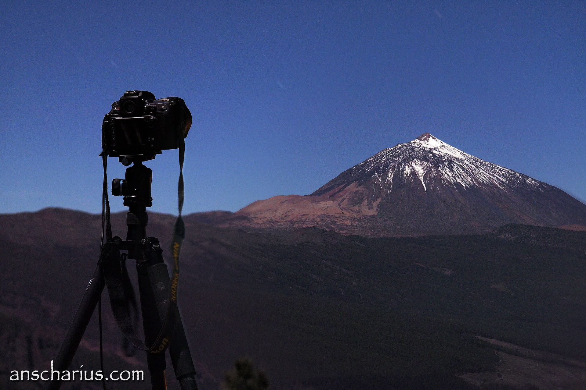 Es geht weiter zur nächsten Location. Es ist eine nicht weit entfernte Stelle die mein Freund Wolfgang mal als den „Grand-Canyon von Teneriffa“ bezeichnet hat. Dort kann man das Auto gut abstellen und bewaffnet mit meinen Kameras geht es einen kleinen Hügel hinauf auf einen gewaltigen Felsvorsprung. Von hier aus kann ich La Orotava und Puerto de la Cruz sehen. Gleich links oberhalb thront majestätisch der Pico del Teide sehr fotogen am Horizont. Direkt von oben beleuchtet das Mondlicht die Szenerie auf fast gespenstische Art und Weise.