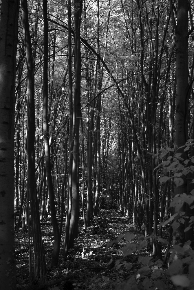 Es geht weiter und ich komme an eine Lichtung mit tollem Gegenlicht. Nun hauche ich auch mal den Infrarot-Filter an und hoffe auf ein cooles Ergebnis. Aber es ist nur ein Gegenlichtbild mit flauen Kontrasten in der Bildmitte und tiefem Schwarz an den Bildrändern.