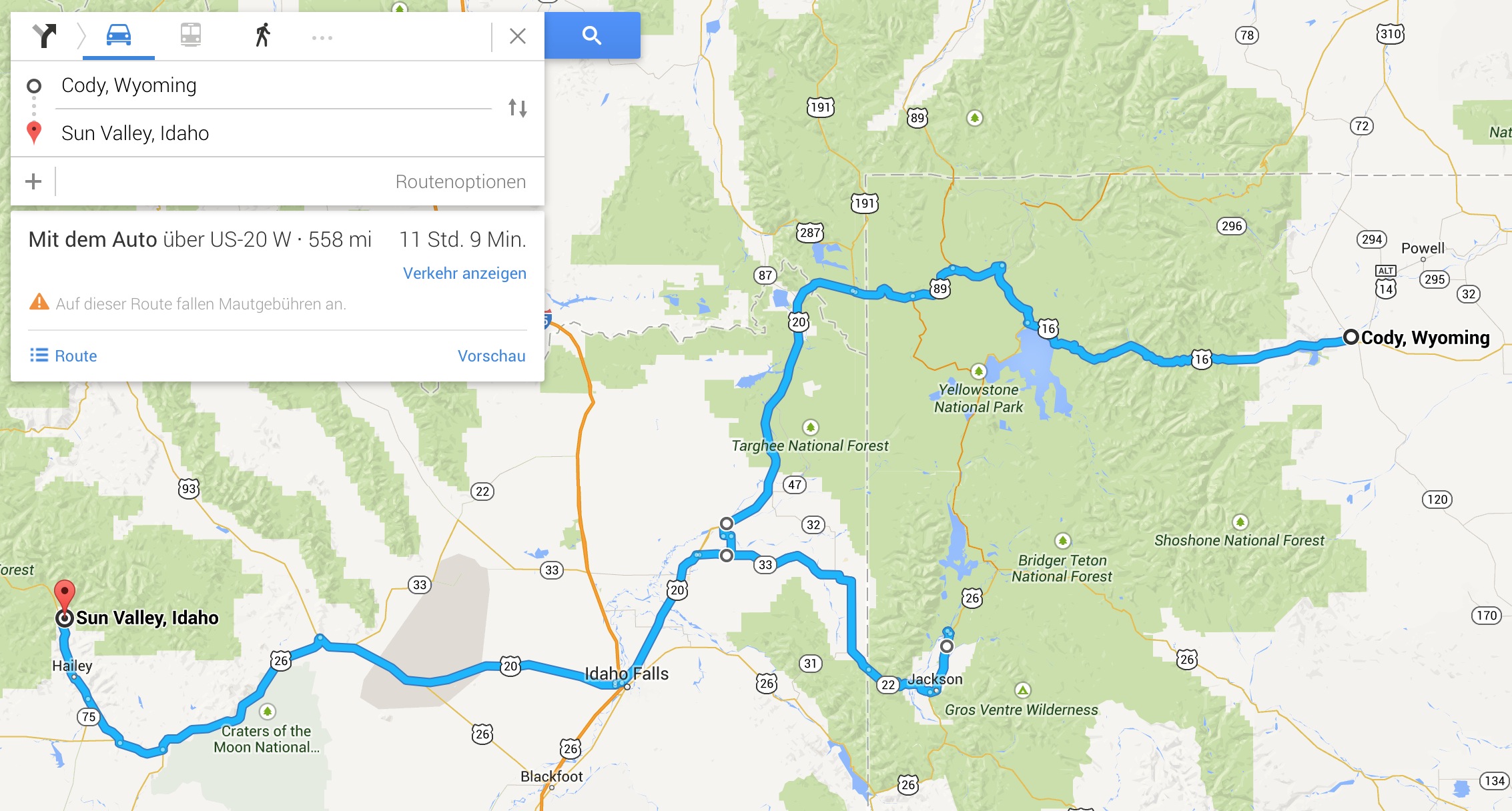 Es ist der elfte Tag in den USA. Meine Sandra hat ihre erste Nacht in Las Vegas verbracht und wird heute nach Billings in Montana fliegen. Das ist wirklich weit weg im Nord-Osten und damit sie dort nicht allzu lange allein auf mich warten muss, soll es heute von Sun Valley in Idahoe nach Cody in Wyoming am östlichen Eingang des Yellowstone National Parks gehen.