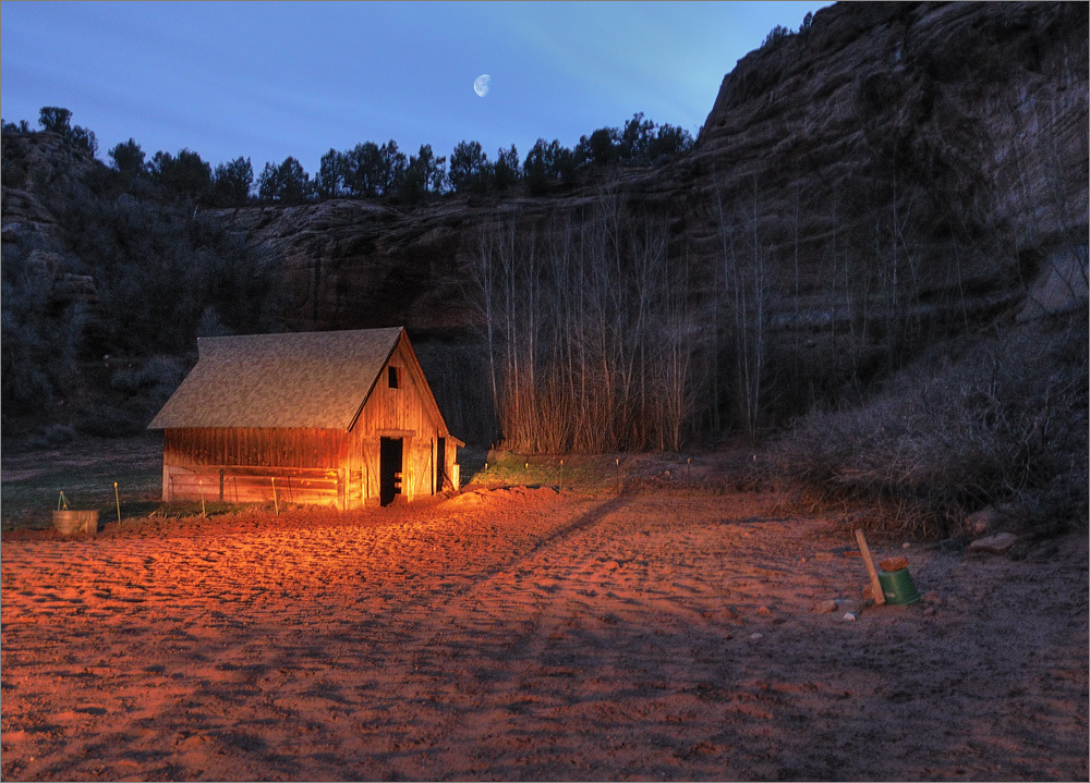 Während ich mit 65 mph dahin zuckle muss ich an den Prospekt aus dem Motel denken. Da stand etwas mit 107 Dingen die man hier tun könnte. Dazu zählt auch „Ein Fotos des Eagle Gate Arch im Johnson Canyon“ machen. Nur, wo ist dieser Canyon? Hätte ich den Ranger fragen sollen? Während ich grüble rauscht an mir ein Wegweiser vorbei „Johnson Canyon ->“ – hart auf die Bremse, wenden und schon bin ich im Spiel. Die Straße durch den Canyon ist gut asphaltiert und um mich herum liegt überall noch frischer Schnee, das Thermometer zeigt 2°C. Die Sonne scheint immer wieder zwischen den großen schweren Wolken hindurch. Ich fahre ganz langsam weiter und warte auf einen Wegweiser zum „Eagle Gate Arch“. Normalerweise ist hier ja jede zwei Mülltonne als „Historic Site“ ausgeschildert. Aber diesmal finde ich KEINEN Wegweiser. Aber ich finde das kleine Movie-Set an dem vor vielen Jahren Teile der Fernsehserie Gunsmoke gedreht wurden. In Deutschland hieß sie „Rauchende Colts“ und ich habe sie als Kind geliebt!