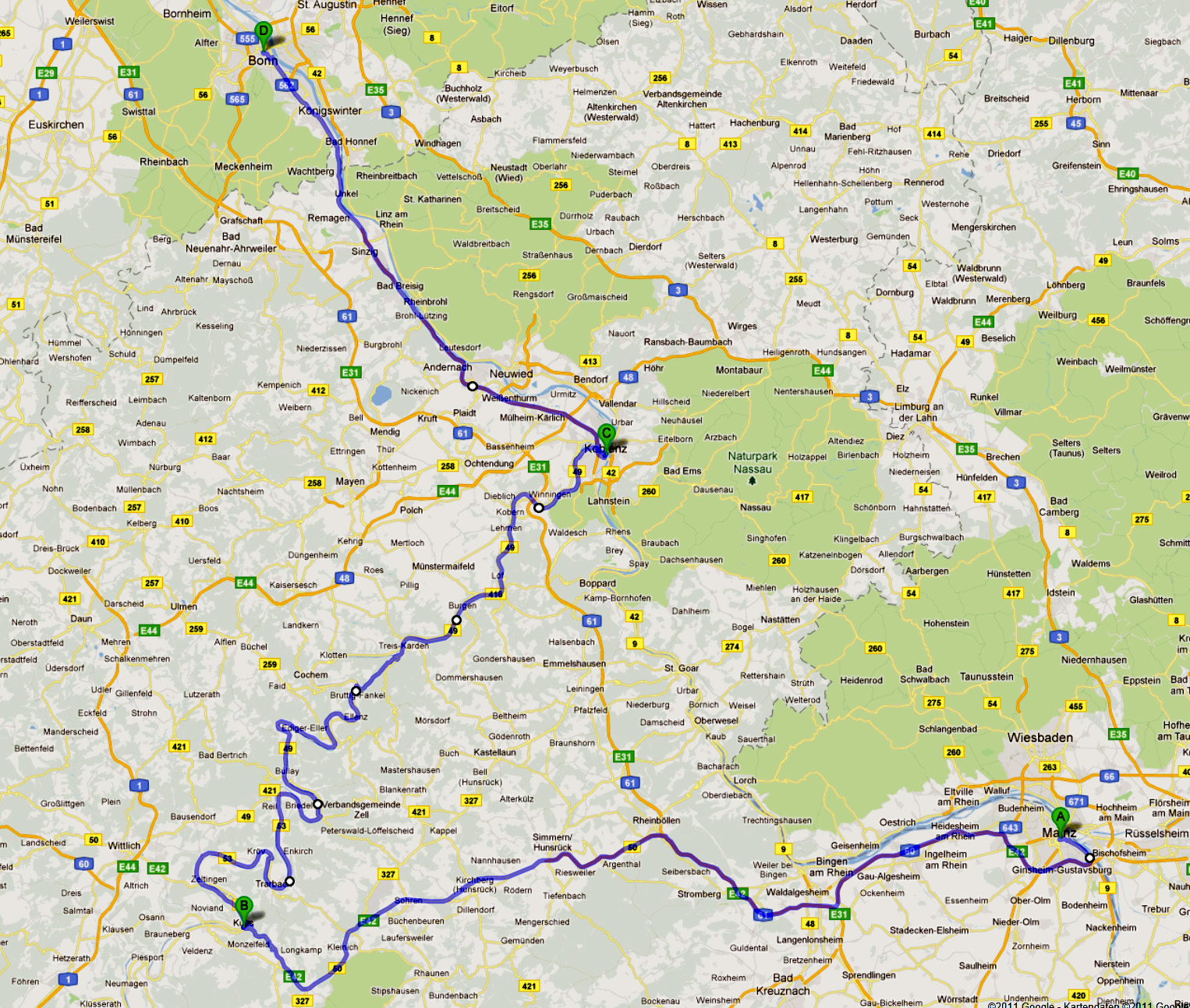 Wir starten in Bingen und fahren auf der B9 vorbei an St. Goar, Bacharach, Boppard, Oberwesel, Koblenz, Bad Breisig, Remagen, Oberwinter bis nach Bonn. Immer wieder eine schöne Tour, auch wenn es mal regnet. Es ist wie im „echten“ Leben, da scheint auch nicht immer nur die Sonne…