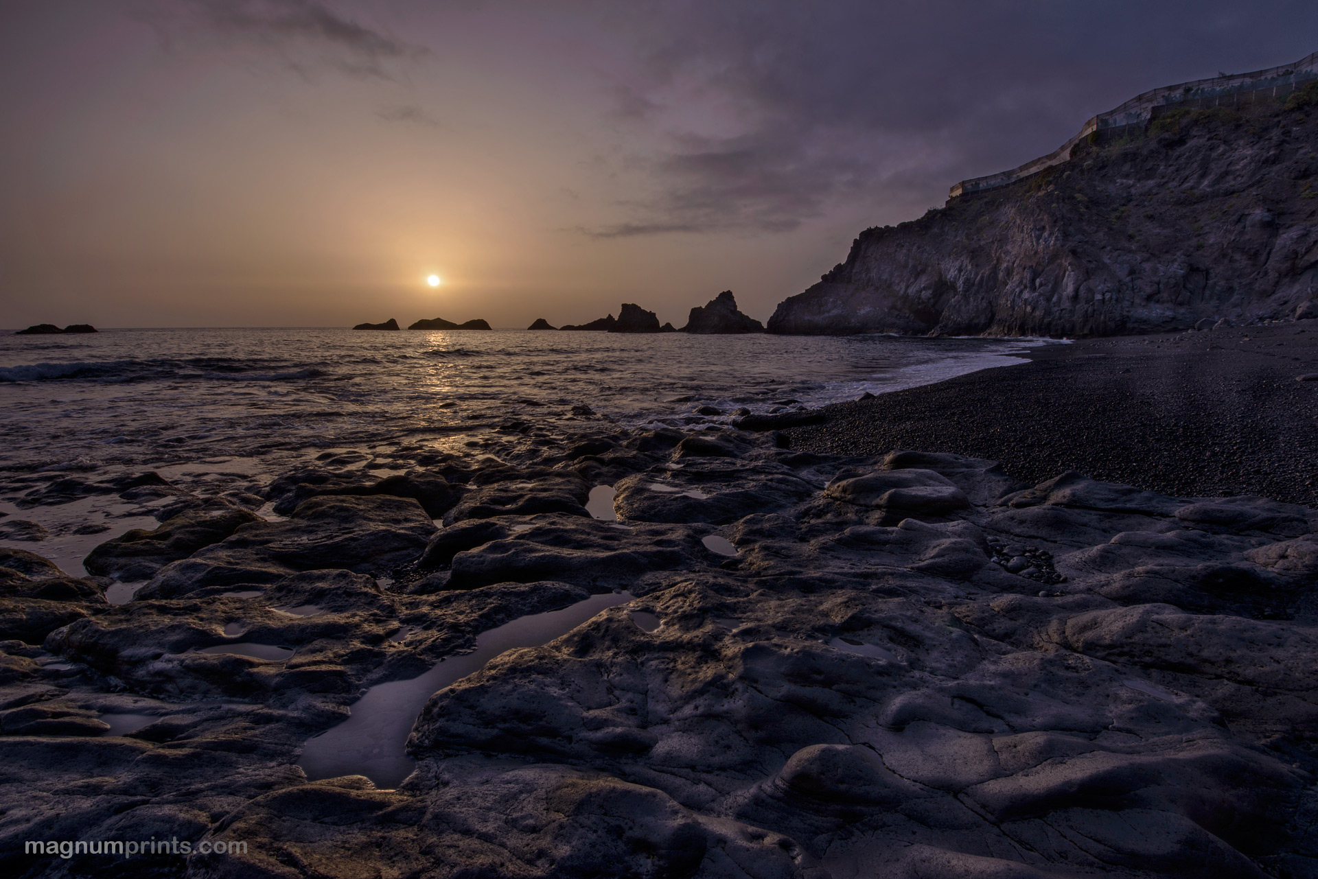 Die Sonnen hat den ganzen Tag über die schwarzen Lavawände und den schwarzen Lavastrand aufgeheizt. Durch die unmittelbare Nähe zum Meer ist es unerträglich heiß und schwül. Nach kurzer Zeit habe ich meine Kleidung komplett durchgeschwitzt und das Wasser tropft mit von der Stirn. Es ist wirklich nicht witzig und es fällt schwer sich immer wieder zu bücken und hinter die Kamera zu kauern. Bei Belichtungszeiten von bis zu 30s muss man still und regungslos hinter der Kamera verharren und den Kabelauslöser ruhig in der Hand halten, keine einfache Aufgabe! Aber es entsteht eine Belichtungsreihe nach der Anderen und insgeheim freue ich mich schon darauf meine „Beute“ zu sichten.