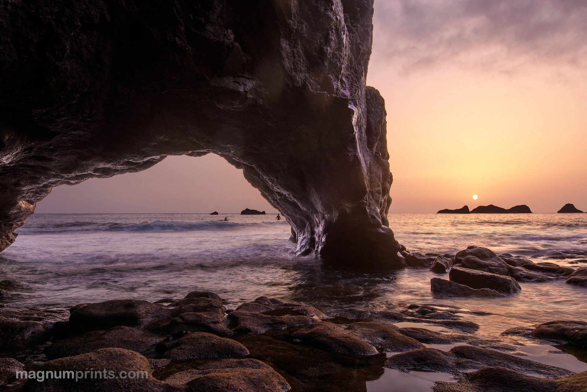 Während die Videokamera sich tapfer gegen Wind und Wetter wehrt und eifrig ein Bild nach dem anderen aufnimmt bin ich mit dem größeren neuen BILORA XedriLux white und der Nikon D800E unterwegs. Auf der linken Seite der Bucht gibt es einen Durchbruch in der schwarzen Felsenklippe. Dahinter baden zwei Jungs mit kleinen Surfboards im recht ruhigen Meer. Es ist wieder Ebbe und so ist der Durchbruch unter der Klippe recht gut erreichbar. Allerdings sind die Felsen schwer glitschig und man muss gut aufpassen hier nicht zu stürzen. Das könnte üble Folgen haben, denn man muss hier auf dicken glitschigen Steinen balancieren, wer hier abrutscht hat sich schnell einen Fuß verstaucht oder gar gebrochen. Damit dann die vielen Treppenstufen hinauf zu klettern, das wäre nicht wirklich witzig! Also Vorsicht!!