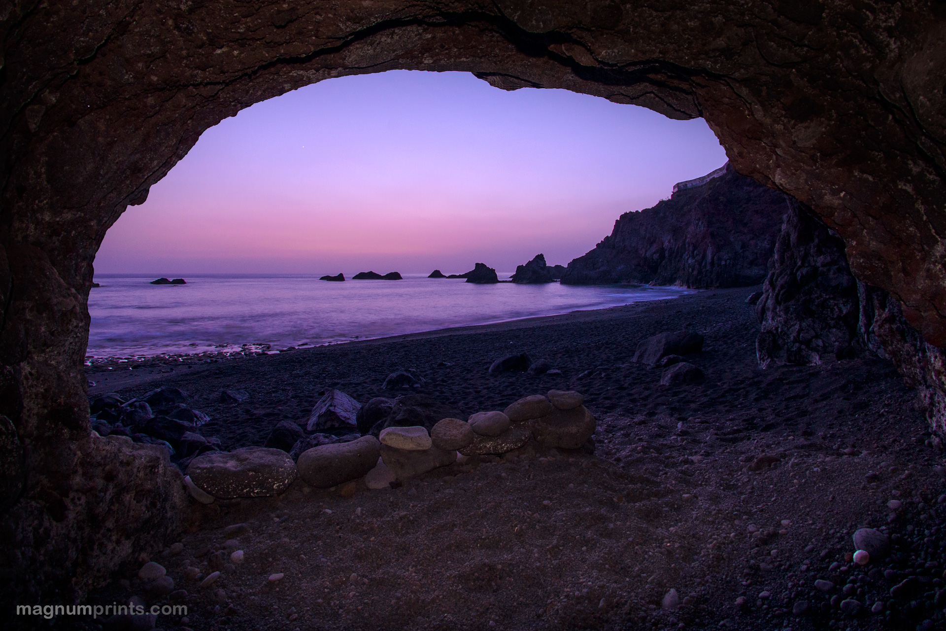 Einige Bilder später ist es fast stockfinster und ich muss abbrechen auch wenn ich noch gern weitermachen würde. Vorsichtig taste ich mich aus der Höhle heraus, nun nicht den Kopf stoßen! Meine Videokamera kann ich allerdings nicht mehr sehen. Sie muss aber da draußen irgendwo stehen. Es dauert nicht lange und sie ist gefunden, ich bin einfach meinen Fußspuren an diesem einsamen Strand gefolgt – geht doch!