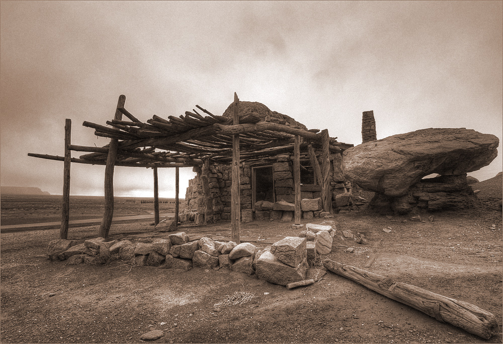 Als ich an der Schotterpiste ankomme überkommt mich noch einmal kurz der Wagemut. Ich fahre weiter nach Osten. Aber auch das endet einfach nur im Nichts vor einigen kleinen Farmgebäuden. Ich kehre um. Dann an einer größeren „Kreuzung“ kann man links in Richtung Süd-Osten abbiegen, warum nicht? Ich bin nun auf einer gut ausgebauten Schotterpiste. Die Landschaft ist super und es gibt immer wieder krasse Felsen links des Weges. Dann sehe ich in der Ferne einen Felsen der ein gewaltiges rundes Loch hat. Da könnte man mit ein wenig Forschen und Probieren sicher ein paar coole Fotos machen. Aber es führt keine Straße dorthin und es sind sicher mehrere Kilometer, auch wenn er zum greifen Nahe scheint. Egal, ich fahre weiter nach Osten. Auf dem Navi kann ich sehen, dass der südlich Highway in Richtung Kayenta nicht weit weg ist. Das Navi zeigt einen Punkt namens „Little Rocks“ an. Den wähle ich mal als Ziel und folge den Angaben meines Copiloten. Doch auch das geht schief. Ich lande schließlich wieder auf einer Farm zwischen kläffenden Hunden. Eigentlich dürfte ich auch hier gar nicht sein, das schlechte Gewissen meldet sich wieder, es geht so unauffällig wie möglich zurück zur Schotterpiste. Es geht weiter und weiter und weiter. Dies Indian Route nimmt echt kein Ende. Immer wieder kleine Zelte, Holzhütten, Kühe, Pferde, alles sehr ärmlich.