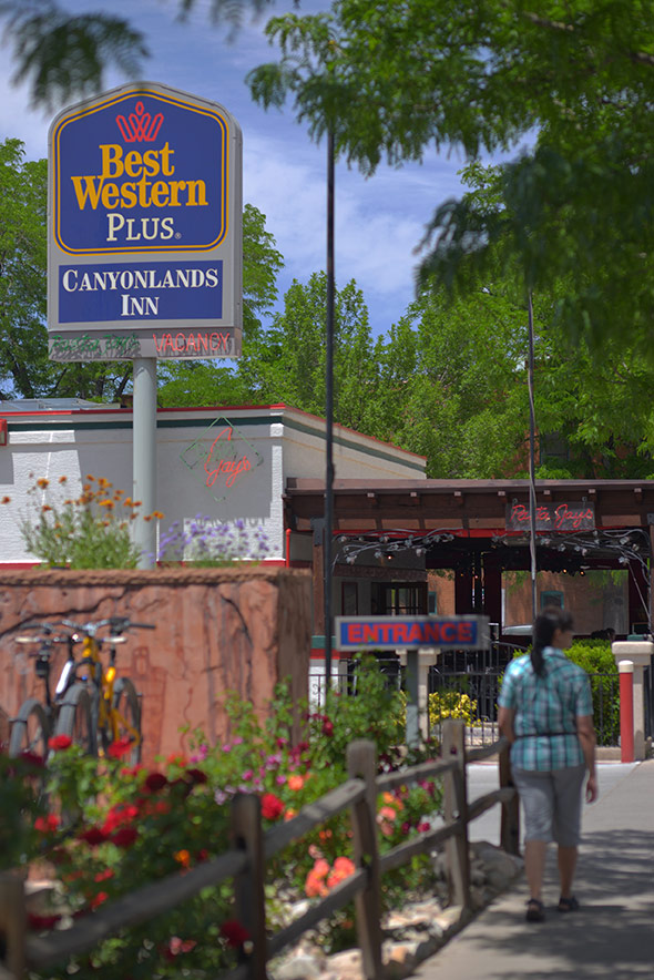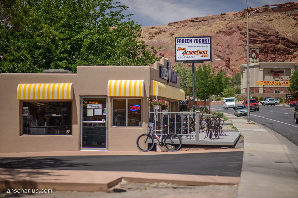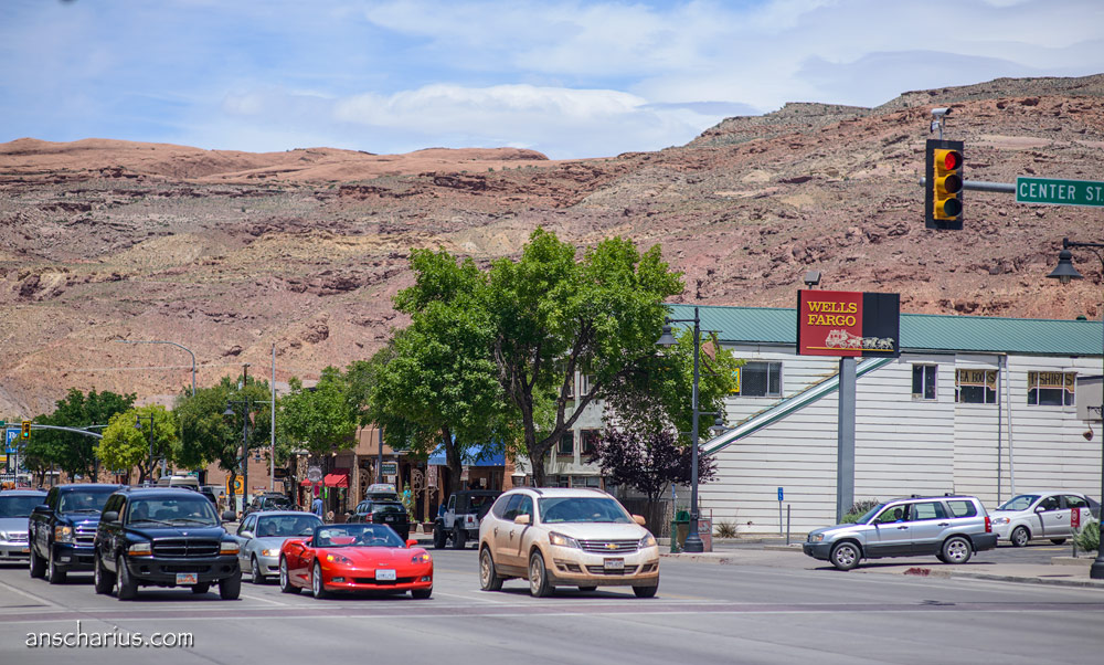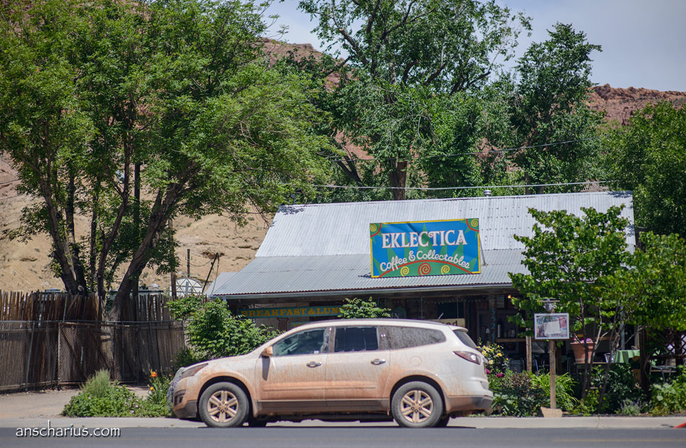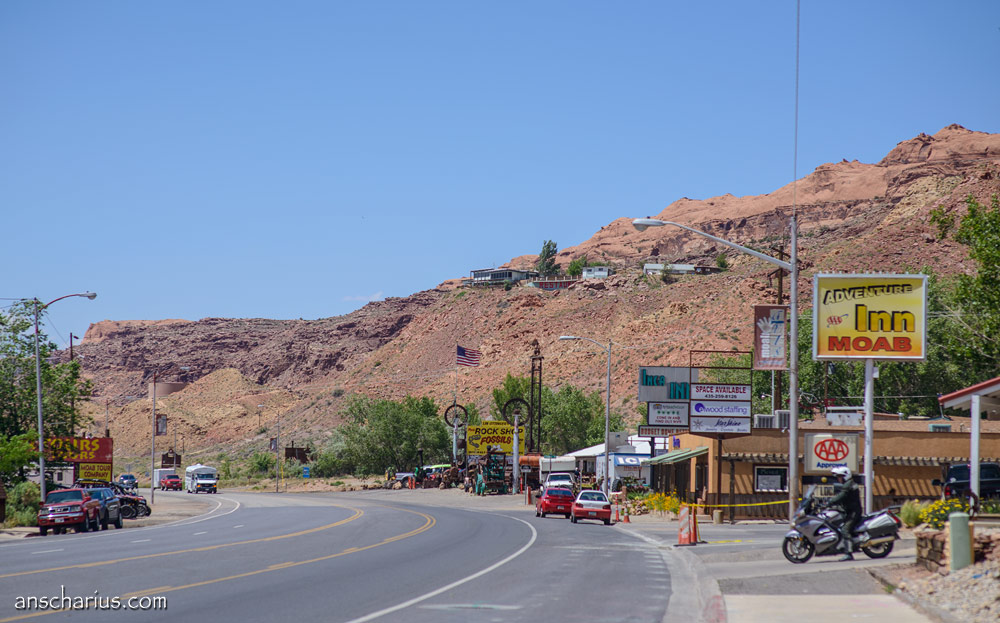 Der Weg zurück zum Motel fällt mir wirklich schwer und ich muss mich sehr konzentrieren weil immer wieder schwarze Rinder mitten auf der Straße stehen oder kleine Hasen vorbeizusehen. Jetzt noch einen Unfall zu haben, das muss nicht sein. Als ich am Parkplatz in der Nähe des Mesa Arch vorbeifahre stehen dort schon mehr als 20 Autos, der Himmel über den La Aal Mountains ist schon gelblich eingefärbt und die Wolken über mir haben nun schon etwas mehr Kontur als während unserer Fotosession in der False Kiva. „Rudelknipsen am Mesa Arch“ kommt es mir in den Sinn. Das habe ich auch schon mehrfach erlebt und dort trotzdem eines meiner bislang besten Fotos aufgenommen. Wäre ich nicht so sehr neben der Spur, ich würde die paar hundert Meter zum Mesa Arch laufen und das „magische rote Leuchten“ statt mit 12 MPix nun mit satten 36,3 Megapixeln fotografieren. Aber es geht mir nicht gut und so muss ich auf dieses Gemeinschafts-Erlebnis heute leider verzichten. Aber mein Fotos aus dem Jahr 2009 ist mit der Zeit nicht schlechter geworden und so fällt es leicht einfach weiterzufahren.