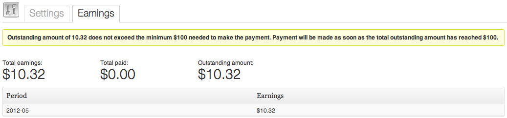 Schaut man sich diese Aufstellung genauer an, so war der erste Monate noch halbwegs lukrativ. Mit nur 17.455 Werbe-Einblendungen konnte ich sagenhafte 24,06 US-Dollar verdienen, also etwa 20 Euro. Das entspricht 0,138 US-Cent pro Werbe-Einblendung. Mit zehn Werbe-Einblendungen ließ sich im ersten Monat also etwa 1 Euro-Cent verdienen. Im März 2013 wurden satte 57.708 Werbe-Botschaften angezeigt aber es kamen dadurch nur noch magere 9,36 US-$ zustande. Dies entspricht 0,0162 US-Cent pro Werbe-Block. Bezogen auf zehn Werbe-Blöcke wären wir damit bei etwa 0,12 Euro-Cent, also nur etwa 1/10 der Einnahmen des ersten Monats.