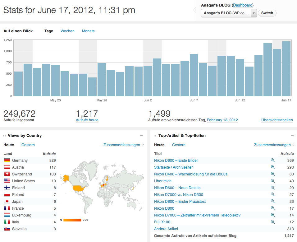 Mit dem Erscheinen der Nikon D800, D7100 und zuletzt der Nikon Df konnte ich an einzelnen Tagen bis zu 7.000 Aufrufe pro Tag verzeichnen. Auch ist ein BLOG stark von der Jahreszeit abhängig. Bei schlechtem Wetter werden deutlich mehr Artikel gelesen als an den letzten schönen Sonnentagen eines Jahres.