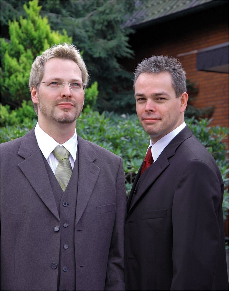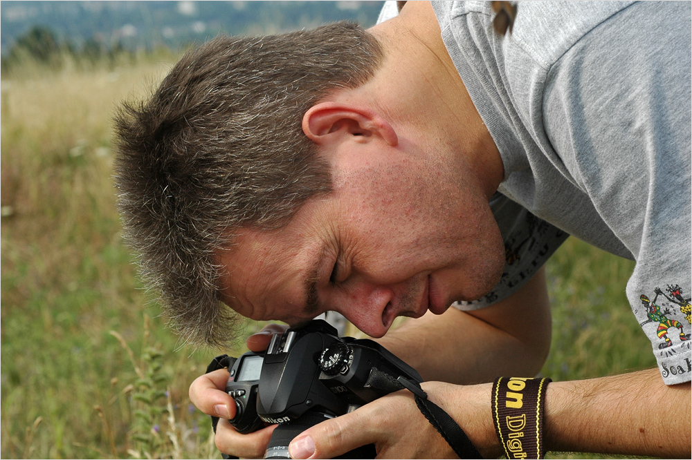 Meine Kameraausrüstung ist noch die gleiche wie beim Vortag. Ich habe die Olympus OM-D E-M1 mit einigen Objektiven dabei. Zuerst fotografiere ich die zwei mit dem ausgezeichneten Panasonic 2,8/35-100mm Zoom-Objektiv. Dabei kommt ein Polfilter zum Einsatz. An der Kamera ist der RAW-Modus eingestellt und ich fotografiere bei ISO-200 mit der Zeitautomatik. So kann ich über die Öffnung der Blende sehr schön die Tiefenschärfe steuern. Bei etwa 100mm Brennweite muss ich schon einige Meter zurück treten wenn ich unser Paar beispielsweise im Hochformat vollständig ablichten möchte. Für Aufnahmen auf denen nur ihre Gesichter zu sehen sind kann ich näher heran kommen und durch einfaches Verschieben des aktiven Autofokus-Messfeldes kann ich mal auf ihr und mal auf sein Gesicht fokussieren. Bei der Kamera habe ich den schnellen Serienbild-Modus aktiviert und ich schieße immer gleich ganze Serien von 10 bis 20 Bildern. Zwischendurch versuche ich den Beiden einige Anweisungen zu geben, damit die Fotos etwa so werden wie ich es mir vorstelle. Aber es ist nicht ganz einfach, es ist auch noch Wolfgang mit dabei und manchmal schaut er Wolfgang an und sie meine Kamera und dann ist es auch schon wieder umgekehrt. Ich versuche ihre Blicke in die gleiche Richtung zu lenken in dem ich sie bitte mal knapp über meine linke und dann über die rechte Schulter zu blicken. Nichts sieht bei einem Paar-Shooting blöder aus, als wenn sie in unterschiedliche Richtungen schauen. Das wirkt auf den Fotos so, als hätten sie sich nichts mehr zu sagen und als wären sie sich uneinig was sie denn wollen. Das kann natürlich auch eine Aussage sein, aber heute erscheint sie mir nicht gewünscht zu sein.